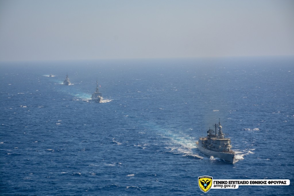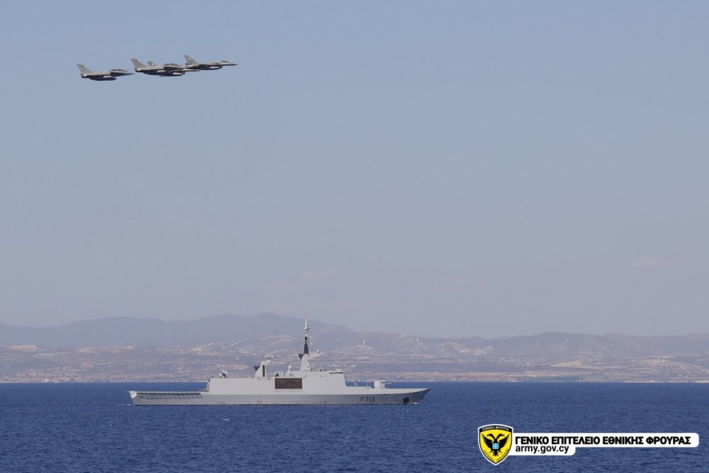 Στο πλαίσιο διεξαγωγής της τετραμερούς άσκησης (QUAD Exercise) με την ονομασία «EUNOMIA-2/2021» (04-07 Οκτωβρίου 2021) πραγματοποιήθηκε σήμερα η Ημέρα Διακεκριμένων Επισκεπτών (DV-Day) με τη συμμετοχή του Αρχηγού της Εθνικής Φρουράς, Αντιστράτηγου Δημόκριτου Ζερβάκη, της Πρέσβειρας της Γαλλίας στην Κυπριακή Δημοκρατία (ΚΔ), κας Salina Grenet-Catalano, του Επιχειρησιακού Διοικητή των Γαλλικών Δυνάμεων Μεσογείου, Υποναύαρχου Jean Emmanuel Roux De Louze, του Επιτελάρχη του Γενικού Επιτελείου Εθνικής Άμυνας της Ελλάδας, Αντιπτέραρχου (Ι) Γεώργιου Φασούλα, καθώς και των Ακόλουθων Άμυνας της Γαλλίας και της Ιταλίας στην ΚΔ, ως εκπρόσωπων των 4 Κρατών (Κύπρος, Ελλάδα, Γαλλία, Ιταλία) που λαμβάνουν μέρος στην άσκηση. Σύμφωνα με ανακοίνωση του Γενικού Επιτελείου Εθνικής Φρουράς, οι Διακεκριμένοι Επισκέπτες, οι οποίοι επιβιβάστηκαν επί της Φρεγάτας (Φ/Γ) ΚΟΥΝΤΟΥΡΙΩΤΗΣ του Πολεμικού Ναυτικού της Ελλάδας, είχαν την ευκαιρία να παρακολουθήσουν, εν πλω στη θαλάσσια περιοχή νότια Λεμεσού, διάφορα σενάρια της τελικής φάσης της άσκησης, στην οποία συμμετείχαν Πλωτά και Πτητικά μέσα των 4 Κρατών. Κατά τη διεξαγωγή της άσκησης «EUNOMIA-2/2021», εξετάστηκαν μεταξύ άλλων, αντικείμενα που αφορούν σε αεροναυτικές επιχειρήσεις, σε επιχειρήσεις θαλάσσιας απαγόρευσης και Έρευνας-Διάσωσης (Ε-Δ), αντιμετώπιση ασύμμετρων απειλών, πυρά επιφανείας, καθώς και αντιαεροπορικές – ανθυποβρυχιακές επιχειρήσεις. Ειδικότερα, κατά τη διεξαγωγή των εκπαιδευτικών αντικειμένων της τελικής φάσης, συμμετείχαν η Γαλλική Φ/Γ FS ACONIT, η Φ/Γ ΚΟΥΝΤΟΥΡΙΩΤΗΣ, η Ιταλική Φ/Γ ITS LIBECCIO, με τα Οργανικά τους Ελικόπτερα, καθώς και το ΠΑΘ ΙΩΑΝΝΙΔΗΣ με Ομάδα Υποβρυχίων Καταστροφών, από την Εθνική Φρουρά. Από πλευράς Πτητικών Μέσων έλαβαν μέρος στην τελική φάση ένα Ελικόπτερο AW-139 από την Εθνική Φρουρά σε σενάριο Ε-Δ με τη Φ/Γ FS ACONIT, υπό τον συντονισμό του Κέντρου Συντονισμού Έρευνας και Διάσωσης, καθώς και 2 ζεύγη Μαχητικών Αεροσκαφών, τύπου RAFALE και F-16, της Γαλλικής Πολεμικής Αεροπορίας (ΠΑ) και της ΠΑ της Ελλάδας, αντίστοιχα. Η διεξαγωγή της τετραμερούς άσκησης «EUNOMIA», για δεύτερη συνεχόμενη χρονιά, καταδεικνύει τη συλλογική πρόθεση και δέσμευση των τεσσάρων Κρατών για την από κοινού αεροναυτική παρουσία στην περιοχή της Ανατολικής Μεσογείου με σκοπό την εφαρμογή του Διεθνούς Δικαίου της Θάλασσας (UNCLOS), την προαγωγή και διατήρηση της ασφάλειας και σταθερότητας, καθώς και τη διαφύλαξη της ελευθερίας στη ναυσιπλοΐα. Ο Αρχηγός με την ολοκλήρωση της τελικής φάσης, χαιρέτησε τα πληρώματα που συμμετείχαν στην άσκηση και παρέδωσε, επί της Φ/Γ ΚΟΥΝΤΟΥΡΙΩΤΗΣ αναμνηστικές πλακέτες στους εκπροσώπους των χωρών που συμμετείχαν. Στον σύντομο χαιρετισμό του, συνεχάρη τους συμμετέχοντες και σημείωσε ότι σε τακτικό και επιχειρησιακό επίπεδο, η άσκηση συνέβαλε στην επαύξηση της διαλειτουργικότητας μεταξύ των Ναυτικών και Αεροπορικών δυνάμεων, καθώς και της ικανότητας να συντονίζουν κοινές δράσεις σε διεθνή ύδατα, με τη σχεδίαση και διεξαγωγή ευρέως φάσματος αεροναυτικών επιχειρήσεων.