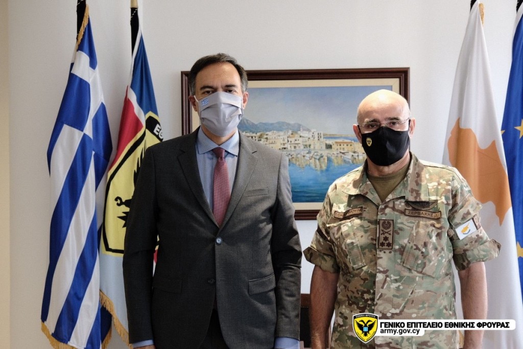 Επίσκεψη στο Στρατηγείο του Γενικού Επιτελείου Εθνικής Φρουράς ενόψει της ανάληψης των καθηκόντων του πραγματοποίησε σήμερα Τρίτη 19 Οκτωβρίου ο νέος Πρέσβης της Ελλάδας στην Κυπριακή Δημοκρατία, κ. Ιωάννης Παπαμελετίου και συναντήθηκε με τον Αρχηγό της ΕΦ, Αντιστράτηγο Δημόκριτο Ζερβάκη. Όπως ανακοινώθηκε από το ΓΕΕΦ, κατά τη συνάντηση, αφού πρώτα ο κ. Αρχηγός καλωσόρισε τον κ. Παπαμελετίου, συζητήθηκαν οι προκλήσεις ασφαλείας στην περιοχή της Ανατολικής Μεσογείου, ενώ αναδείχθηκε το άριστο επίπεδο των σχέσεων μεταξύ Ελλάδας και Κύπρου σε όλους τους τομείς δίδοντας ιδιαίτερη έμφαση στη στρατιωτική συνεργασία μεταξύ των Ενόπλων Δυνάμεων των δυο χωρών.