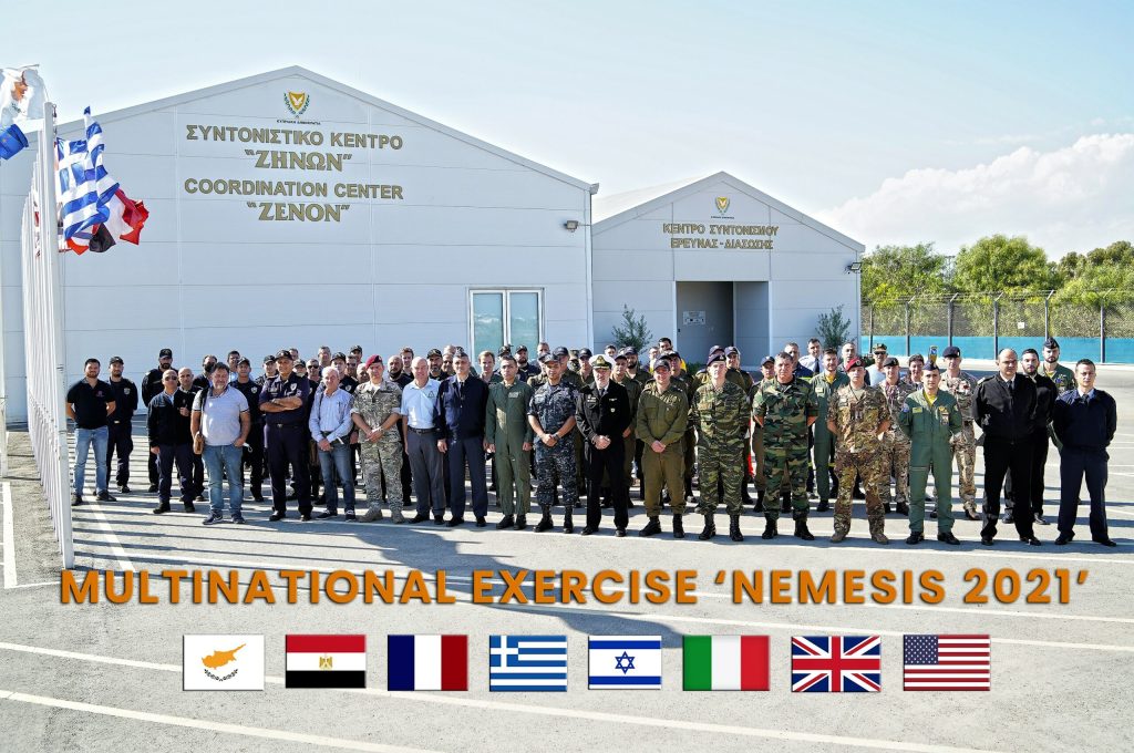 Με τη Φρεγάτα ΚΟΥΝΤΟΥΡΙΩΤΗΣ, ένα Αεροσκάφος C-130, προσωπικό από την 31η Μοίρα Επιχειρήσεων Έρευνας και Διάσωσης (31η ΜΕΕΔ) και το 747 Ειδικό Τάγμα Μηχανικού (ΕΤΜΧ) συμμετείχαν οι Ένοπλες Δυνάμεις στην Διεθνή Αεροναυτική Άσκηση «ΝΕΜΕΣΙΣ 21». Η εν λόγω άσκηση πραγματοποιήθηκε στην θαλάσσια περιοχή νοτίως της Κύπρου χθες Τετάρτη 3 Νοεμβρίου. Στην Άσκηση συμμετείχαν επίσης με μέσα και προσωπικό η Κύπρος, η Αίγυπτος, η Γαλλία, το Ηνωμένο Βασίλειο, οι ΗΠΑ, το Ισραήλ και η Ιταλία. Σκοπός της «ΝΕΜΕΣΙΣ 21», η οποία σχεδιάστηκε και συντονίστηκε από το Κέντρο Συντονισμού Έρευνας και Διάσωσης (ΚΣΕΔ) και το Υφυπουργείο Ναυτιλίας της Κυπριακής Δημοκρατίας καθώς και από την Εθνική Φρουρά σε συνεργασία με τα Γενικά Επιτελεία Εθνικής Άμυνας των υπόλοιπων Χωρών, ήταν η εξάσκηση και εκπαίδευση των συμμετεχόντων σε σενάρια Έρευνας και Διάσωσης, αντιμετώπισης ασύμμετρων απειλών και τρομοκρατικής ενέργειας σε πλατφόρμα εξόρυξης υδρογονανθράκων, προστασίας θαλάσσιου περιβάλλοντος, μαζικής διάσωσης συνεπεία εγκατάλειψης της πλατφόρμας, νηοψίας σε ύποπτα πλοία, πυρόσβεσης σε πλοία, απεγκλωβισμού και αεροδιακομιδής τραυματιών, καθώς και αντιμετώπισης θαλάσσιας ρύπανσης, όπως ανακοινώθηκε από το ΓΕΕΘΑ. Η εν λόγω συνεκπαίδευση πραγματοποιήθηκε στο πλαίσιο των διεθνών συνεργασιών των Ελληνικών Ενόπλων Δυνάμεων συμφώνως του σχεδιασμού του ΓΕΕΘΑ και συνέβαλε στην προαγωγή του επιπέδου της επιχειρησιακής ετοιμότητας, μαχητικής ικανότητας και συνεργασίας των συμμετεχόντων σε διμερές και πολυμερές πλαίσιο, καθώς και στην εξοικείωση τους σε επιχειρήσεις προστασίας κρίσιμων υποδομών στην περιοχή της Ανατολικής Μεσογείου.