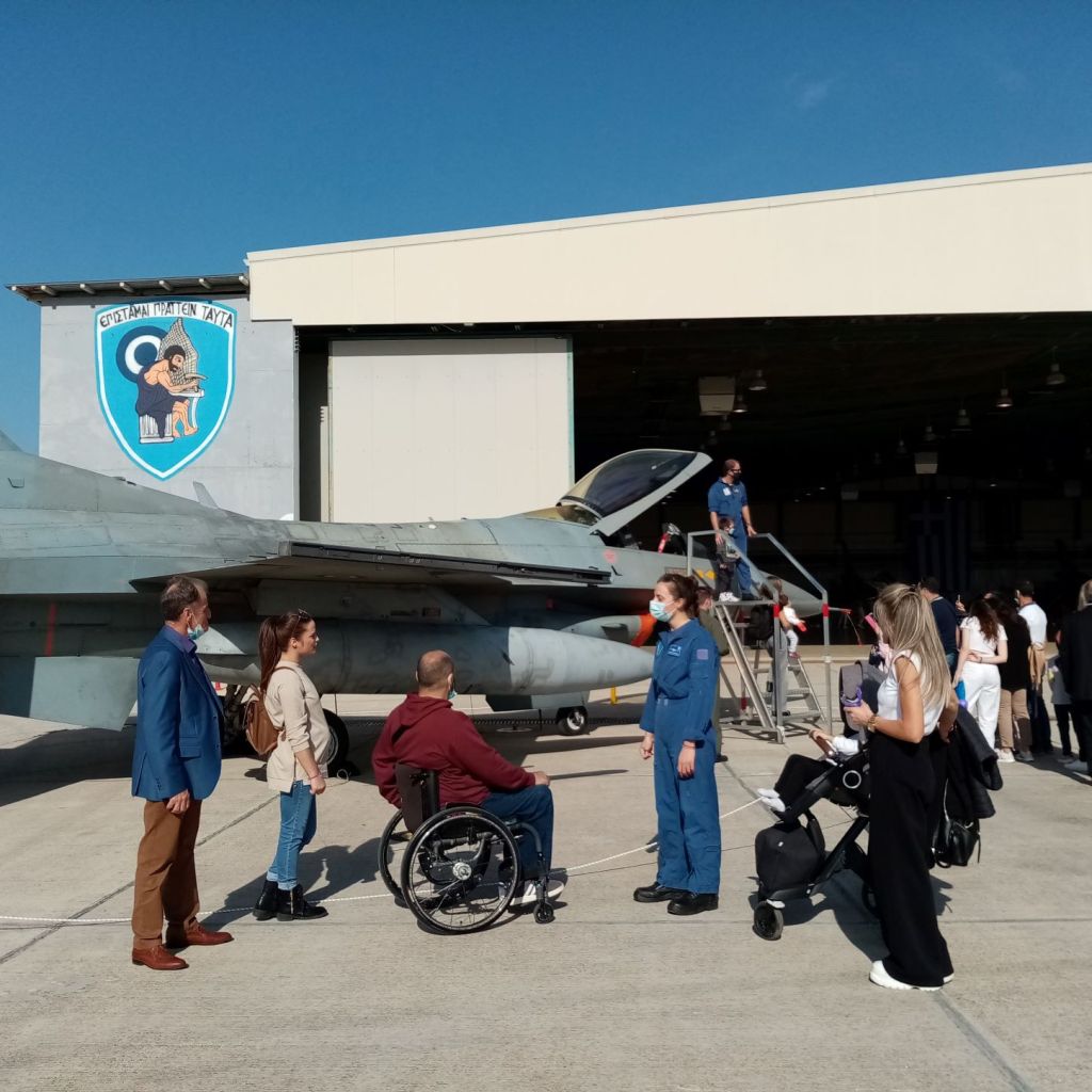 Τονίζεται ότι όλο το προσωπικό της Μοίρας με πολύ ευγένεια και χαρά ενημέρωνε τους επισκέπτες περί του αεροπορικού πολεμικού υλικού και απαντούσε σε κάθε απορία. Μια νεαρή υπαξιωματικός, του τεχνικού τμήματος, πολύ καταρτισμένη, ανέλαβε ευγενικά να κατατοπίσει και εμάς γύρω από τις πτητικές ικανότητες των F-16. Όπως ήταν φυσικό, δεν αντισταθήκαμε στον πειρασμό, παρά το γεγονός ότι ο ήλιος έψηνε στην κυριολεξία, να σταθούμε υπομονετικά στην σειρά αναμονής, με τις απαιτούμενες υγειονομικές αποστάσεις, για να φωτογραφηθούμε στο κοκπιτ ενός μονοθεσίου αυτού του τύπου με τη βοήθεια του πιλότου του. Είδαμε τον αεροκινητήρα, τις βόμβες, τους πυραύλους, τα φυσίγγια του πυροβόλου, το Recce που λειτουργεί ως φωτογραφική κάμερα, τις στολές προσωπικού και γενικότερα πήραμε μια εικόνα από όλο τον σύγχρονο αλλά και παλαιότερο εξοπλισμό μιας καλά οργανωμένης μάχιμης αεροπορικής μονάδας. Συγκίνηση μας προκάλεσε επίσης και η θέα από τα “εν αποστρατεία” πια F-104 και Α-7 Corsair που φορούν μονίμως το χακί της παραλλαγής ωσάν παλαιοί συνταξιούχοι κομάντο. Τα αεροσκάφη αυτά έγραψαν την δική τους ιστορική πορεία στο μεγάλο βιβλίο της Ελληνικής Πολεμικής Αεροπορίας.