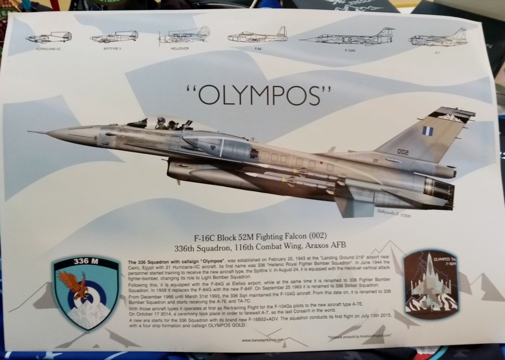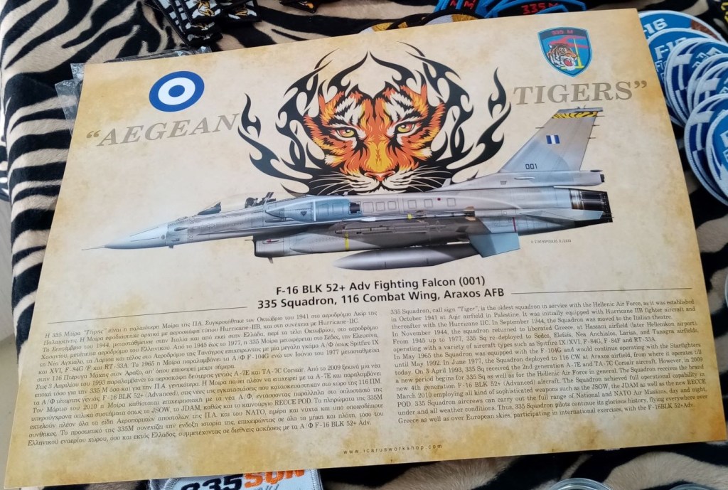 Στο χώρο της έκθεσης υπήρχε επετειακό ενημερωτικό φυλλάδιο στην Ελληνική και Αγγλική γλώσσα της 335 Μοίρας με αναφορά σε κάποια πολύ ενδιαφέροντα στοιχεία που θα έπρεπε όλοι μας να γνωρίζουμε και παραθέτουμε το εξής κείμενο: “Η 335 Μοίρα «Τίγρης» είναι η παλιότερη Μοίρα της Π.Α. Συγκροτήθηκε τον Οκτώβριο του 1941 στο αεροδρόμιο Ακίρ της Παλαιστίνης. Η Μοίρα εφοδιάστηκε αρχικά με αεροσκάφη τύπου Hurricane-ΙΙB και στη συνέχεια με Hurricane-IIC. Τον Σεπτέμβριο του 1944 μεταστάθμευσε στην Ιταλία και από εκεί στην Ελλάδα, περί τα τέλη Οκτωβρίου, στο αεροδρόμιο Χασανίου, μετέπειτα αεροδρόμιο Ελληνικού. Από το 1945 έως το 1977, η 335 Μοίρα μεταφέρεται στο Σέδες, την Ελευσίνα, την Νέα Αγχίαλο, τη Λάρισα και τέλος στο αεροδρόμιο της Τανάγρας επιχειρώντας με μια μεγάλη γκάμα Α/Φ όπως Spitfire IX και XVI, F-84G/F και RT-33A. Το 1965 η Μοίρα παραλαμβάνει τα Α/Φ F-104G ενώ τον Ιούνιο του 1977 μετασταθμεύει στην 116 Πτέρυγα Μάχης στον Άραξο, απ΄όπου επιχειρεί μέχρι σήμερα.