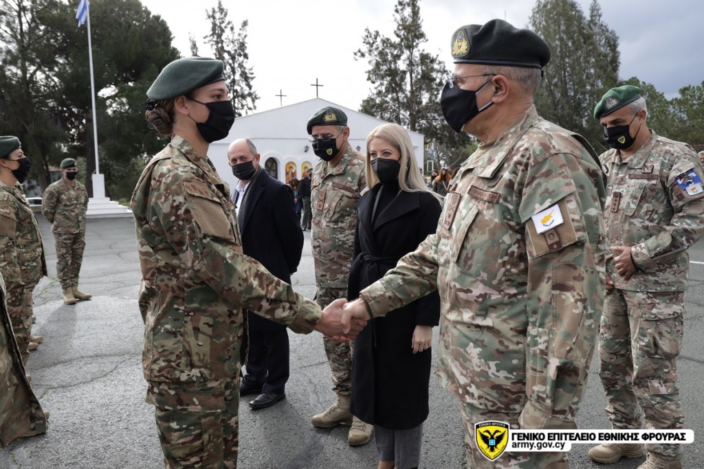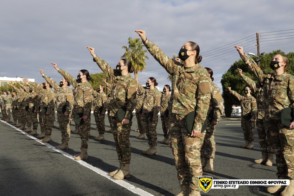 Τελετή διαβεβαίωσης των γυναικών Συμβασιούχων Οπλιτών (ΣΥΟΠ) της 11ης εκπαιδευτικής σειράς πραγματοποιήθηκε στο Στρατόπεδο «Λοχία Ευμένιου Παναγιώτου» στην Λεμεσό σήμερα Παρασκευή 4 Φεβρουαρίου, παρουσία της Προέδρου της Βουλής των Αντιπροσώπων, κας Αννίτας Δημητρίου, του Αρχηγού της Εθνικής Φρουράς, Αντιστράτηγου Δημόκριτου Ζερβάκη και του Διοικητή της 3ης Ταξιαρχίας Υποστηρίξεως, Ταξίαρχου Γιαννάκη Παντελίδη. Οι γυναίκες ΣΥΟΠ, ολοκληρώνοντας την Βασική Εκπαίδευση τους στο ΚΕΝ Λεμεσού, τοποθετήθηκαν σε Μονάδες της Εθνικής Φρουράς, στις οποίες θα παρουσιαστούν για να παρακολουθήσουν τα σχολεία εκπαίδευσης της ειδικότητας τους. Ο Αρχηγός ΕΦ στην Ημερήσια Διαταγή του, καλωσόρισε τις νέες ΣΥΟΠ στη στρατιωτική οικογένεια και αναφέρθηκε στην μεγάλη τιμή και ευθύνη που ανέλαβαν με το να θέσουν τον εαυτό τους στην υπηρεσία της Πατρίδας, όπως ανακοινώθηκε από το ΓΕΕΦ. Παράλληλα, τις κάλεσε να αφιερώσουν το μέγιστο των δυνάμεών τους για να ανταποκριθούν στις απαιτήσεις της εκπαιδεύσεως καθώς και στις υψηλές προσδοκίες τόσο της Εθνικής Φρουράς όσο και του Κυπριακού λαού. Καταλήγοντας, τις προέτρεψε να είναι έτοιμες να ανταποκριθούν στην νέα επαγγελματική πρόκληση, εργαζόμενες με αποφασιστικότητα, ψυχραιμία και σεμνότητα βελτιώνοντας συνεχώς τις ικανότητές τους μέσα από τη συνεχή εκπαίδευση, υπερήφανες για την επιλογή τους να ενταχθούν στις τάξεις της Εθνικής Φρουράς.