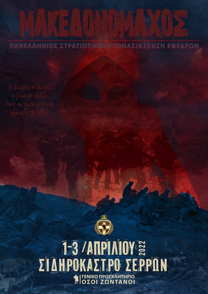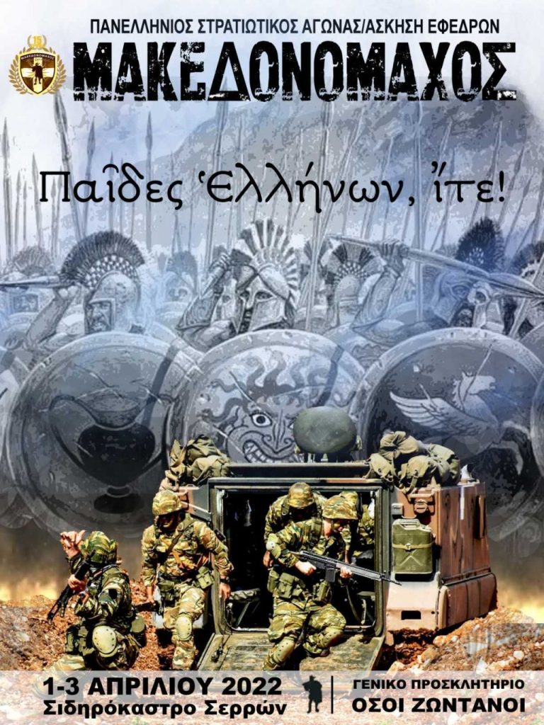 Πριν λίγο καιρό, είδαμε στο Διαδίκτυο την ενδιαφέρουσα αφίσα του “ΜΑΚΕΔΟΝΟΜΑΧΟΥ 2022”. Στο φόντο υπήρχαν αρχαίοι πολεμιστές και μπροστά μια φωτογραφία από σύγχρονη στρατιωτική άσκηση. Η αφίσα έγραφε: «ΠΑΝΕΛΛΗΝΙΟΣ ΣΤΡΑΤΙΩΤΙΚΟΣ ΑΓΩΝΑΣ/ΑΣΚΗΣΗ ΕΦΕΔΡΩΝ “ΜΑΚΕΔΟΝΟΜΑΧΟΣ” Παίδες Ελλήνων, ίτε! από 1-3 Απριλίου Σιδηρόκαστρο Σερρών – Γενικό Προσκλητήριο – Όσοι Ζωντανοί».