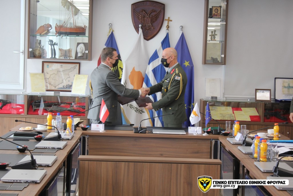 Το πρώτο Πρόγραμμα Διμερούς Αμυντικής Συνεργασίας (ΠΔΑΣ) μεταξύ της Εθνικής Φρουράς (ΕΦ) και των Αυστριακών Ενόπλων Δυνάμεων υπογράφηκε σήμερα στο Στρατηγείο του Γενικού Επιτελείου Εθνικής Φρουράς (ΓΕΕΦ). Η τελετή υπογραφής του προγράμματος πραγματοποιήθηκε στην παρουσία του διαπιστευμένου Ακόλουθου Άμυνας (ΑΚΑΜ) της Αυστρίας στην Κυπριακή Δημοκρατία, Συνταγματάρχη Franz Madner και του Διευθυντή Δ΄ Κλάδου του ΓΕΕΦ, Συνταγματάρχη Λουκά Χατζηκωστάντα.