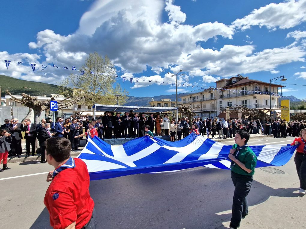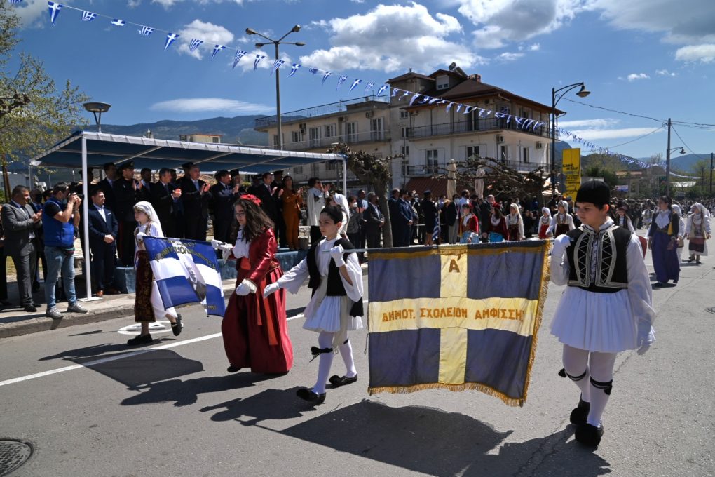 Έλαβε χώρα αρχικά, δοξολογία στον Ιερό Ναό Αγίου Νικολάου Άμφισσας, ακολούθησε τέλεση επιμνημόσυνης δέησης προς τιμήν των Εθνικών μας Ηρώων στην πλατεία Ησαΐα και αργότερα κατάθεση στεφάνου στον ανδριάντα του Επισκόπου Σαλώνων, Ησαΐα. Εν συνεχεία, πραγματοποιήθηκε παρέλαση, στην οποία συμμετείχαν τμήματα από σχολεία όλων των βαθμίδων της Άμφισσας, πολιτιστικούς συλλόγους και σωματεία παραδοσιακής φορεσιάς από διάφορες περιοχές της Ελλάδας, καθώς και παραδοσιακούς χορούς και δρώμενα από χορευτικές ομάδες τοπικών συλλόγων. Στις εκδηλώσεις, όπως αναφέρει ανακοίνωση του ΥΠΕΘΑ, παρέστησαν, μεταξύ άλλων, ο ΥΦΕΘΑ Νικόλαος Χαρδαλιάς, ο Διοικητής του Κέντρου Εκπαίδευσης Πυροβολικού Ταξίαρχος Ιωάννης Σταματάκης ως εκπρόσωπος των Ενόπλων Δυνάμεων, ο Διοικητής Πυροσβεστικών Υπηρεσιών Νομού Φωκίδας Πύραρχος Ευάγγελος Τσιορλίδας, και εκπρόσωποι της Περιφερειακής και της Τοπικής Αυτοδιοίκησης.