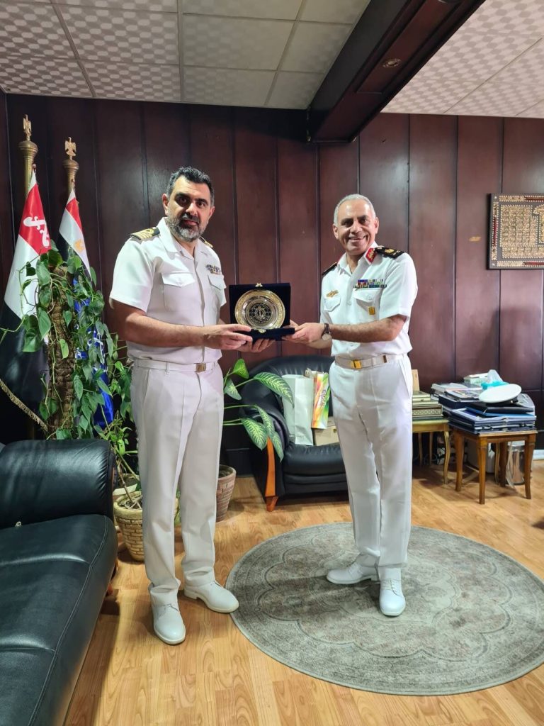 Κατά τη διάρκεια της παραμονής της Φ/Γ ΝΙΚΗΦΟΡΟΣ ΦΩΚΑΣ στην Αλεξάνδρεια, σύμφωνα με ανακοίνωση του ΓΕΕΘΑ, έλαβε χώρα εθιμοτυπική επίσκεψη του Κυβερνήτη στον Διοικητή της Ναυτικής Βάσης Αλεξάνδρειας Rear Admiral Ayman Eldaly.