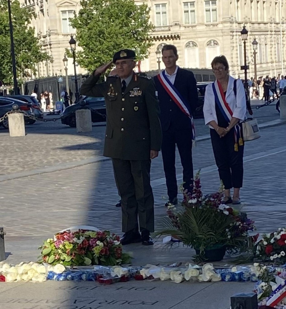 Ειδικότερα σύμφωνα με το πρόγραμμα της επίσκεψης, τη Δευτέρα 13 Ιουνίου ο Αρχηγός κατάθεσε στεφάνι στο Μνημείο του Άγνωστου Στρατιώτη στην Αψίδα του Θριάμβου, αποτίοντας φόρο τιμής στους νεκρούς του Γαλλικού Έθνους. Το βράδυ της ίδιας ημέρας παρέστη στην επίσημη Δεξίωση που παρέθεσε ο Υπουργός Άμυνας της Γαλλίας, Sebastien Lecornu, προς τιμή των επισήμων προσκεκλημένων στην «EUROSATORY 2022».