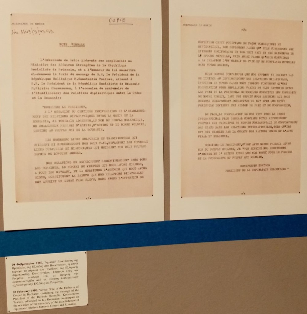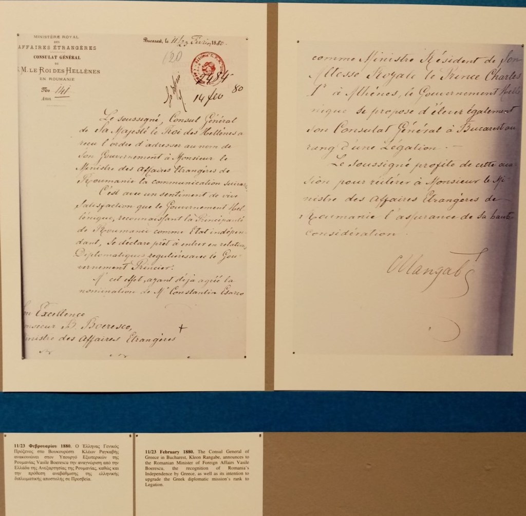 Η Υπηρεσία Διπλωματικού και Ιστορικού Αρχείου του Υπουργείου Εξωτερικών, σε συνεργασία με την Υπηρεσία Διπλωματικών Αρχείων του Υπουργείου Εξωτερικών της Ρουμανίας και την Πρεσβεία της Ρουμανίας στην Αθήνα διοργάνωσε την Έκθεση που αρχικώς σχεδιαζόταν να παρουσιαστεί το 2020 όταν συμπληρώθηκαν 140 χρόνια από τη σύναψη διπλωματικών σχέσεων μεταξύ των δύο κρατών (1880-2020), αλλά αναβλήθηκε λόγω της πανδημίας. Τώρα, 142 χρόνια μετά την σύναψη των Διπλωματικών Σχέσεων ανάμεσα σε Ρουμανία και Ελλάδα, ο επισκέπτης έχει την ευκαιρία να δει από κοντά ενδιαφέροντα εκθέματα που περιλαμβάνουν διπλωματικά έγγραφα από τα Αρχεία των Υπουργείων Εξωτερικών των δύο κρατών. Η Έκθεση αναδεικνύει σημαντικές στιγμές από την ιστορία των Ελληνο-ρουμανικών διπλωματικών και προξενικών σχέσεων, κάνοντας αναφορά στην ίδρυση της πρώτης ελληνικής προξενικής Αρχής στο Βουκουρέστι, το 1834 και συνεχίζοντας με τη διαπίστευση των πρώτων Πρεσβευτών στην Αθήνα και το Βουκουρέστι το 1880 και την ολοκλήρωση της σύναψης διπλωματικών σχέσεων μεταξύ των δύο κρατών.