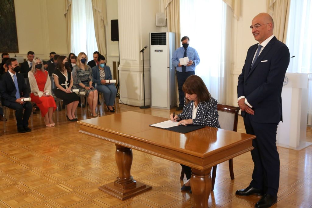H τελετή αποφοίτησης της ΚΣΤ΄ Εκπαιδευτικής Σειράς Υποψηφίων Ακολούθων Πρεσβείας και η απονομή Διπλωμάτων Σπουδών στην ΚΕ΄ Εκπαιδευτική Σειρά Ακολούθων Πρεσβείας πραγματοποιήθηκε σήμερα στο Υπουργείο Εξωτερικών παρουσία της Προέδρου της Δημοκρατίας, Κατερίνας Σακελλαροπούλου, και του Υπουργού Εξωτερικών, Νίκου Δένδια, όπως αναφέρει σχετική ανάρτηση του ΥΠΕΞ στο twitter.