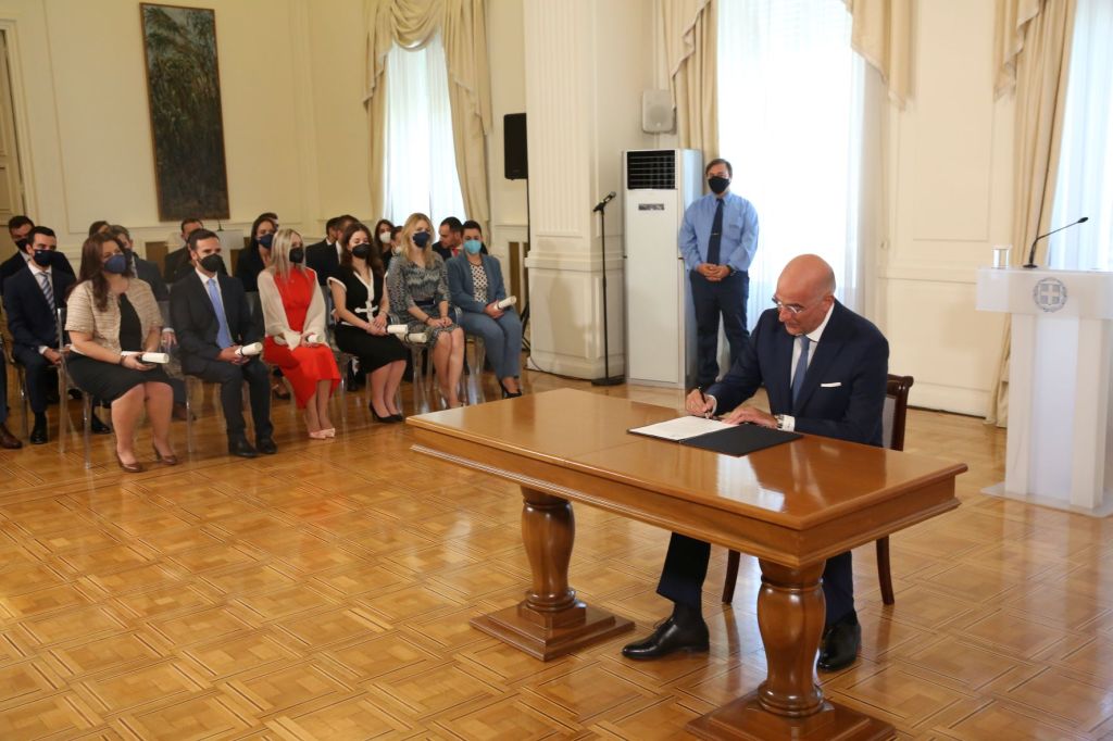 Εσείς είστε η νέα πνοή στο διπλωματικό προσωπικό του Υπουργείου Εξωτερικών. Θα υπηρετήσετε όμως σε έναν διαφορετικό κόσμο και θα υπηρετήσετε, ελπίζω, σε ένα διαφορετικό Υπουργείο Εξωτερικών. Ένα νέο Υπουργείο το οποίο δημιουργείται από την διοικητική και την ψηφιακή μεταρρύθμιση που επιτελείται, ακριβώς για να σας δώσει τη βάση που χρειάζεται για να μπορέσετε να εκπροσωπήσετε τα συμφέροντα της πατρίδας μας σε αυτόν τον διαφορετικό κόσμο.