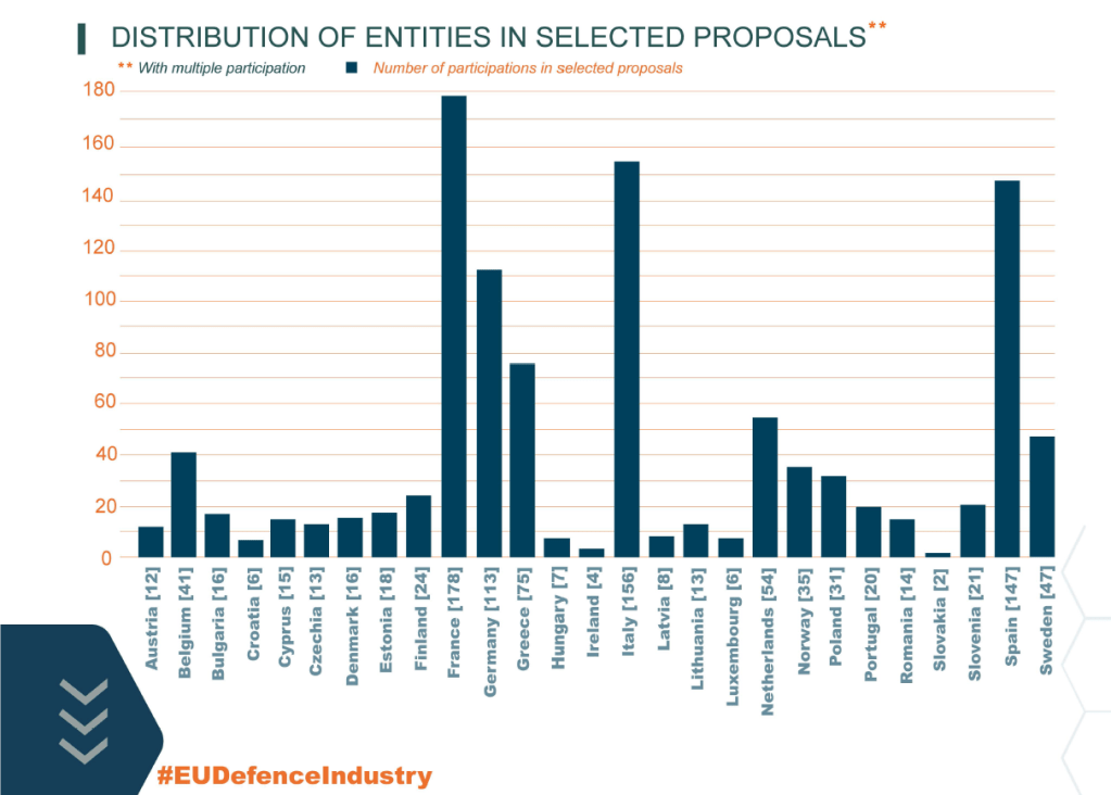 Ειδικότερα, η Ελλάδα βρέθηκε στην 5η θέση (μετά από Γαλλία, Ιταλία, Ισπανία, Γερμανία) με 75 συμμετοχές – προτάσεις που επιλέχθηκαν προς χρηματοδότηση από το Ευρωπαϊκό Ταμείο Άμυνας.