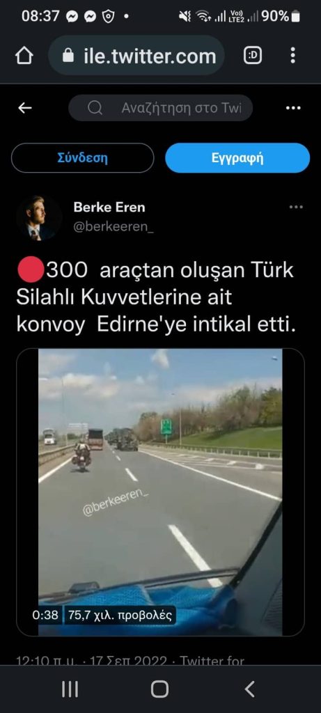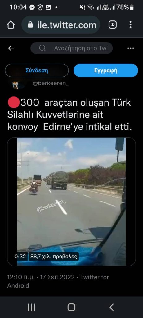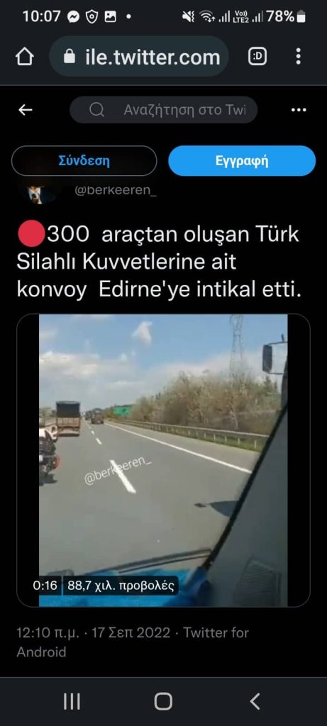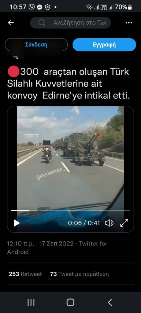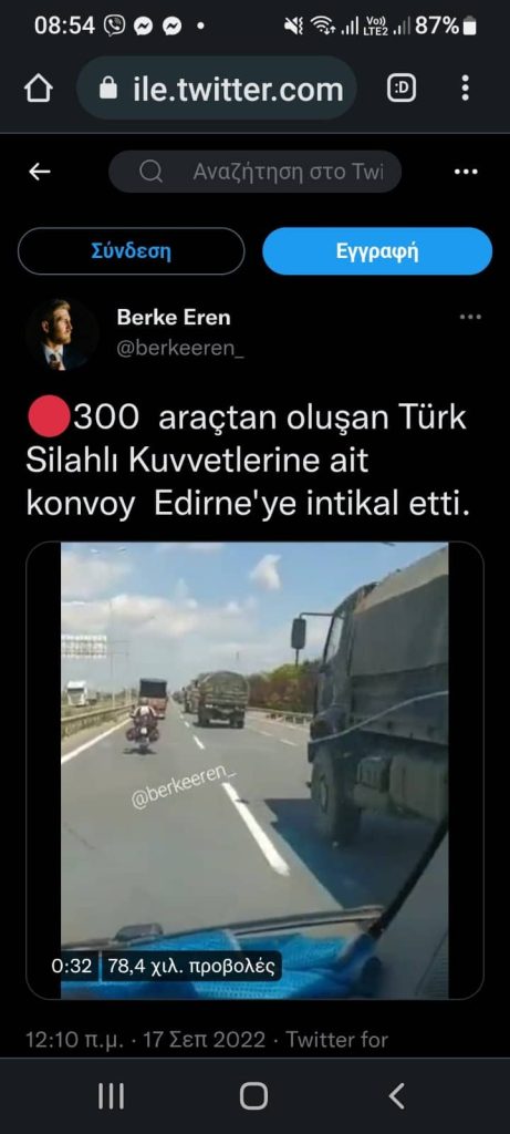 Σήμερα σε τουρκικά Μέσα Κοινωνικής Δικτύωσης παρουσιάζεται φωτογραφικό υλικό και βίντεο με φάλαγγες στρατιωτικών οχημάτων οι οποίες κινούνται προς την Αδριανούπολη / 54 Μ/Κ Ταξιαρχία, διερχόμενα από Νικομήδεια – Κων/πολη. Σχολιαστές της είδησης οι οποίοι εμφανίζονται ως αυτόπτες μάρτυρες και μάλιστα ανάρτησαν και δικό τους φωτογραφικό υλικό κάνουν λόγο για 300 οχήματα διαφόρων τύπων, συμπεριλαμβανομένων αρματοφορέων, οχημάτων μεταφοράς προσωπικού και ρυμουλκούμενων Αντιαεροπορικών Πυροβόλων.