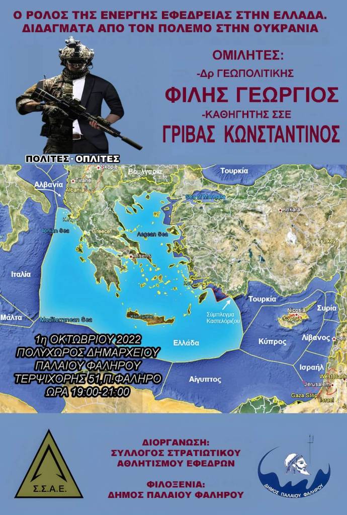 Μια ενημερωτική και ενδιαφέρουσα εκδήλωση διοργανώνει το προσεχές Σάββατο 1η του Οκτώβρη ο δραστήριος Σύλλογος Στρατιωτικού Αθλητισμού Εφέδρων (ΣΣΑΕ). Πρόκειται για την 1η ημερίδα για την Εφεδρεία με θέμα: “Ο ρόλος της ενεργής εφεδρείας στην Ελλάδα – Διδάγματα από τον Πόλεμο στην Ουκρανία”. Κεντρικοί ομιλητές θα είναι ο Καθηγητής Γεωπολιτικής Γεώργιος Φίλης και ο Καθηγητής Γεωπολιτικής και Σύγχρονων Στρατιωτικών Τεχνολογιών Κωνσταντίνος Γρίβας.