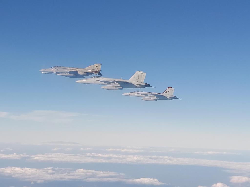 Δύο Α/Φ F-16 της ΠΑ σε αντικείμενα εκπαίδευσης εναέριας μάχης μεταξύ διαφορετικών τύπων αεροσκαφών (Dissimilar Air Combat Training – DACT) σε συνεργασία με 2 Α/Φ F-18 του USS GHWB στην περιοχή δυτικά Πελοποννήσου.