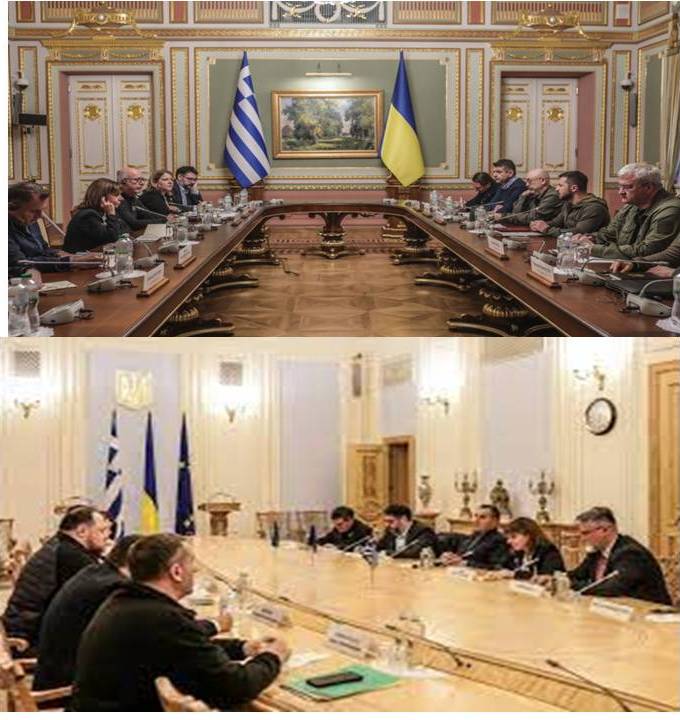 Στην πρώτη φωτογραφία φαίνεται η κ ΠτΔ να συνομιλεί κατά τη διάρκεια της επίσκεψής της στο Κίεβο με ουκρανική αντιπροσωπεία και τον πρόεδρο Ζελένσκυ, ενώ στη δεύτερη δεν διακρίνεται ο Ουκρανός πρόεδρος και οι παρευρισκόμενοι από ουκρανικής πλευράς παραπέμπουν σε κλητήρες ή στην καλύτερη περίπτωση σε υπαλλήλους της Προεδρίας.