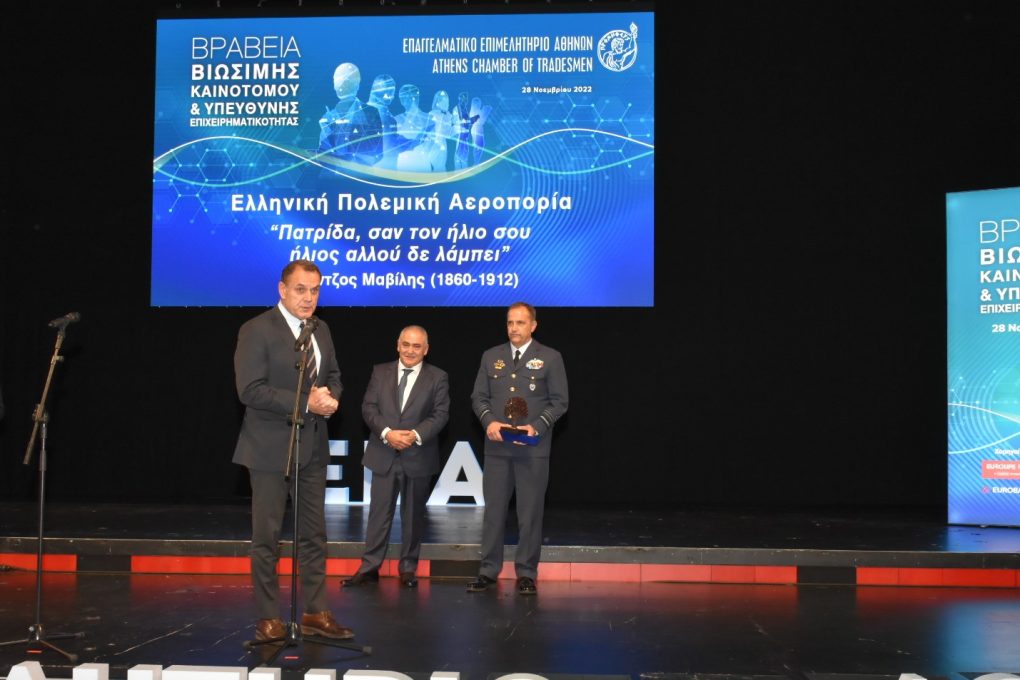 Ειδικό τιμητικό βραβείο απονεμήθει στον Αρχηγό ΓΕΑ Αντιπτέραρχο (Ι) Θεμιστοκλή Μπουρολιά για την προσφορά της Πολεμικής Αεροπορίας στο κοινωνικό σύνολο, στην τελετή που διοργάνωση το Επαγγελματικό Επιμελητήριο Αθηνών για την απονομή Βραβείων Βιώσιμης Καινοτομίας & Υπεύθυνης Επιχειρηματικότητας, στο Κέντρο Πολιτισμού Ίδρυμα «Σταύρος Νιάρχος» χθες Δευτέρα 28 Νοεμβρίου 2022.