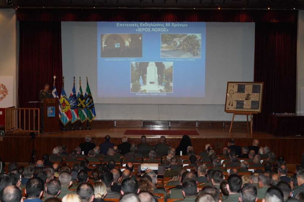 Πρώτος ομιλητής της επετειακής εκδήλωσης ήταν ο Διοικητής της Διοίκησης Ειδικού Πολέμου (ΔΕΠ) του ΓΕΕΘΑ, Αντιστράτηγος Γεώργιος Τσιτσικώστας. Ο Στρατηγός αναφέρθηκε, μεταξύ άλλων, σε προηγηθείσες εκδηλώσεις μνήμης για τον Ιερό Λόχο που έλαβαν χώρα στα νησιά. Επίσης, υπενθύμισε το πρόσφατο ετήσιο μνημόσυνο Πεσόντων Ιερολοχιτών Μέσης Ανατολής που τελέστηκε στο Πεδίο του Άρεως, επεσήμανε την ιδιαίτερη χαρά που νιώθουν οι Αξιωματικοί των Ειδικών Δυνάμεων έχοντας γνωρίσει από κοντά τους Ιερολοχίτες, ανέφερε ότι από το 2017 γίνονται σε τακτική βάση εκδηλώσεις τιμής για τον Ιερό Λόχο και σημείωσε την ιστορική σχέση των αμφίβιων Δυνάμεων με αυτόν. Στον λόγο του, ο έμπειρος Διοικητής, αναφέρθηκε στον Ιερολοχίτη Κωνσταντίνο Κόρκα, μια εμβληματική φυσιογνωμία που “έφυγε” από τη ζωή. Επιπροσθέτως, μας θύμισε πως η Διακλαδική Διοίκηση Ειδικών Επιχειρήσεων ήταν η διάδοχος της 13ης ΔΕΕ, πως τις ίδιες αξίες και ιδανικά που είχαν οι Ιερολοχίτες έχουν οι άνδρες και οι γυναίκες της Διοίκησης Ειδικού Πολέμου και ότι σκοπός της εκδήλωσης ήταν η ανάδειξη του Ιερού Λόχου.