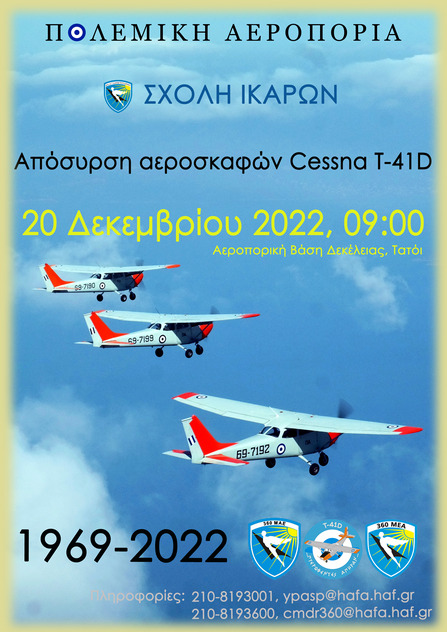 Η τελετή απόσυρσης των αεροσκαφών Cessna T-41D θα πραγματοποιηθεί την Τρίτη 20 Δεκεμβρίου 2022, στην 360 Μοίρα Εκπαίδευσης Αέρος (360ΜΕΑ) της Σχολής Ικάρων, στην Αεροπορική Βάση Δεκέλειας.