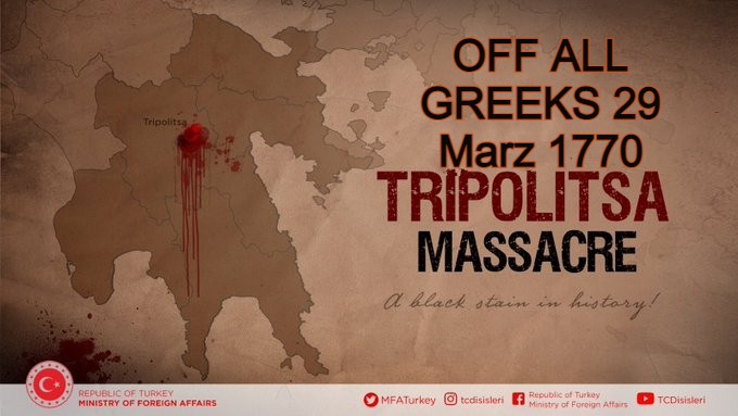 Yeni Safak: Η Τουρκία θα προσφύγει στο Διεθνές Ποινικό Δικαστήριο για την… άλωση της Τριπολιτσάς! Τις 23 Σεπτεμβρίου του 1821 οι Έλληνες ανταπέδωσαν την προ πενήντα ένα ετών τουρκική θηριωδία. Όλοι οι Έλληνες της Τρίπολης (3.000) κατασφάχτηκαν απο τους Τούρκους στα Ορλωφικά! Ο πληθυσμος της Πελοποννήσου μειώθηκε κατά το 1/3 και δεκάδες χιλιάδες πουλήθηκαν στα σκλαβοπάζαρα της Ανατολής. Άν προσθέσουμε τις σφαγή των Ψαρρών, τη γενοκτονία της Χίου (70.000) και την εξόντωση 350.000 Ποντίων η Τουρκία είναι υπόλογη για εγκλήματα κατά της ανθρωπότητας! Αναμένω τους Ακαδημαϊκούς να απαντήσουν στην πρόκληση!