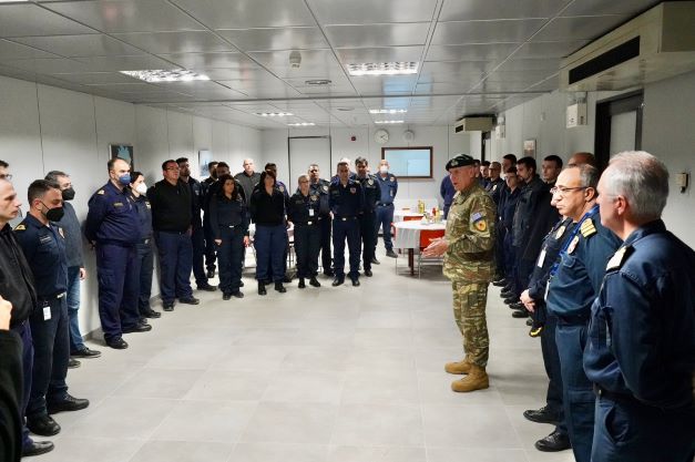 ● Με τους Διοικητές και το προσωπικό του Κέντρου Επιχειρήσεων του Αρχηγείου Στόλου (ΑΣ/ΚΕΠΙΧ) και του Στρατηγείου Διοικήσεως Ανατολικής Μεσογείου (ΣΔΑΜ), και μέσω τηλεδιάσκεψης με τον Κυβερνήτη της Φρεγάτας ΑΙΓΑΙΟΝ και τον επιβαίνοντα Διοικητή εν πλω της επιχείρησης «IRINI» Αρχιπλοίαρχο Στυλιανό Δημόπουλο ΠΝ, καθώς και τους Κυβερνήτες και το προσωπικό της Φρεγάτας ΚΑΝΑΡΗΣ που εκτελεί φυλακή «ΣΚΟΠΟΥΝ», και της Φρεγάτας ΣΠΕΤΣΑΙ που συμμετέχει στην επιχείρηση «UNIFIL».