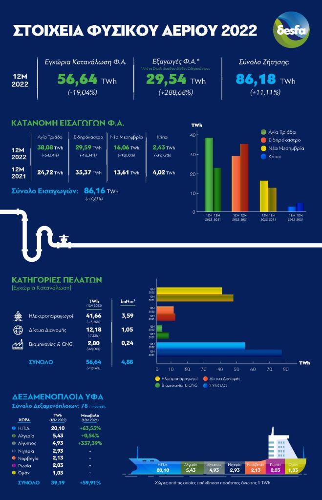 - Ο Τερματικός Σταθμός LNG της Ρεβυθούσας (σημείο εισόδου Αγ. Τριάδα) αποτέλεσε την κύρια πύλη εισόδου φυσικού αερίου στη χώρα για το 2022, καλύπτοντας το 44,2% του συνόλου των εισαγωγών, λαμβάνοντας για πρώτη φορά 78 φορτία από 10 χώρες.