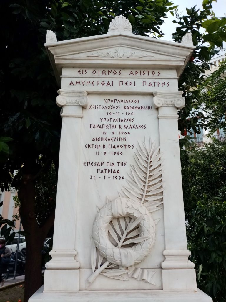 Γράφει το μνημείο και από κάτω χαραγμένα βαθιά στη μαρμάρινη στήλη τα ονόματα υποπλοίαρχος Χριστόδουλος Καραθανάσης (30-11-1961), υποπλοίαρχος Παναγιώτης Βλαχάκος (19-9-1964) και αρχικελευστής Έκτορας Γιαλοψός (11-9-1966)
