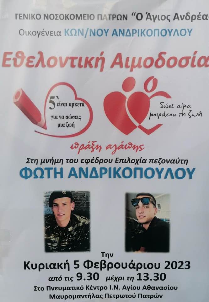 Εθελοντική Αιμοδοσία στη μνήμη του Έφεδρου Λοχία Πεζοναύτη Φώτη Ανδρικόπουλου θα λάβει χώρα μεθαύριο Κυριακή 5 Φεβρουαρίου 2023 και ώρες 09:30 – 13:30 στο Πνευματικό Κέντρο του Ιερού Ναού Αγίου Αθανασίου Μαυρομανδήλας Πετρωτού Πατρών (όπισθεν εγκαταστάσεων Οινοποιίας Achaia Clauss), όπως ανακοινώθηκε από την οικογένειά του.