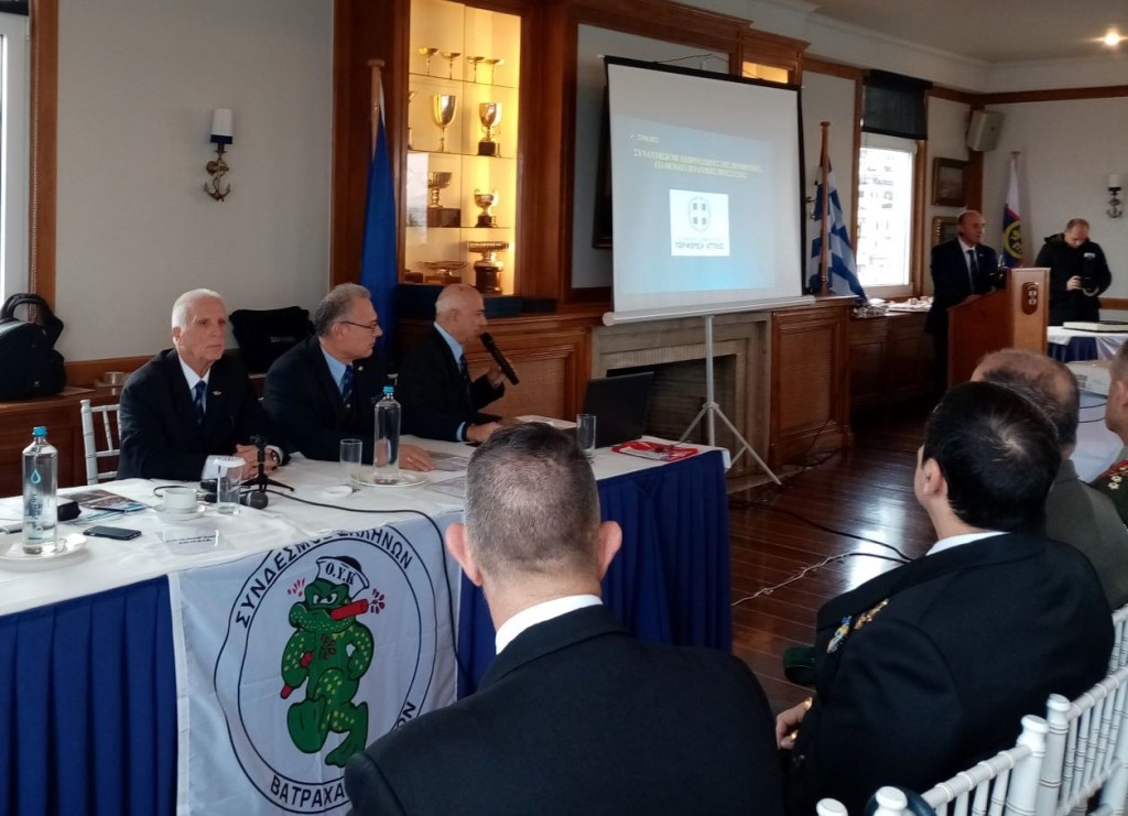 φωτ. ο Πρόεδρος του Συνδέσμου Ελλήνων Βατραχανθρώπων κ.Αλέξανδρος Παλατιανός, Αρχιπλοίαρχος ε.α. ΠΝ στο βήμα των ομιλητών και στα δεξιά του ο κ.Νικόλαος Μούρτης