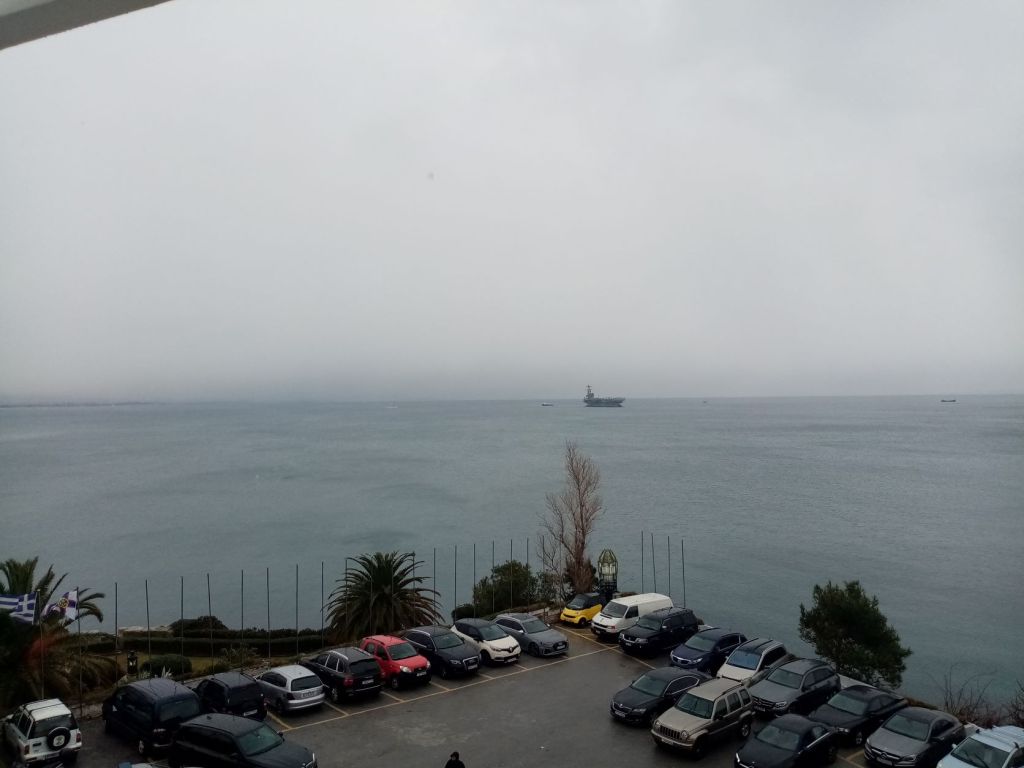 Είδαμε ανοιχτά του Πειραιά στα παγωμένα νερά αγκυροβολημένο το αμερικανικό αεροπλανοφόρο «GEORGE H.W. BUSH» να περιβάλλεται από μια απόκοσμη καταχνιά, το χιονόνερο να πέφτει ασταμάτητα κάνοντάς μας δύτες της στεριάς εάν δεν ανοίγαμε την ομπρέλα μας ενώ το κρύο θέριζε και ήταν μέρα – μεσημέρι.