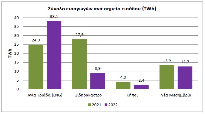 Όσο για την προέλευση των εισαγωγών φυσικού αερίου συνολικά το 2022, το 4,0% αυτών εισήχθη από την Τουρκία (Turkish Basket) μέσω της πύλης των Κήπων, το 20,0% από την πύλη της Νέας Μεσημβρίας – με το αέριο να προέρχεται από το Αζερμπαϊτζάν μεταφερόμενο μέσω των συστήματος αγωγών TANAP-TAP – ενώ την μερίδα του λέοντος (62%), κατείχε το LNG μέσω της πύλης της Αγίας Τριάδας, προερχόμενο από το γειτονικό τερματικό σταθμό της Ρεβυθούσας. Η συνεισφορά του LNG το 2022 θεωρείται μία από τις υψηλότερες των τελευταίων ετών, αναδεικνύοντας τον σημαντικό ρόλο που ήδη παίζει και αναμένεται να παίξει το εν λόγω καύσιμο τα επόμενα χρόνια στο πλαίσιο απεξάρτησης της Ελλάδας από το ρωσικό φυσικό αέριο.