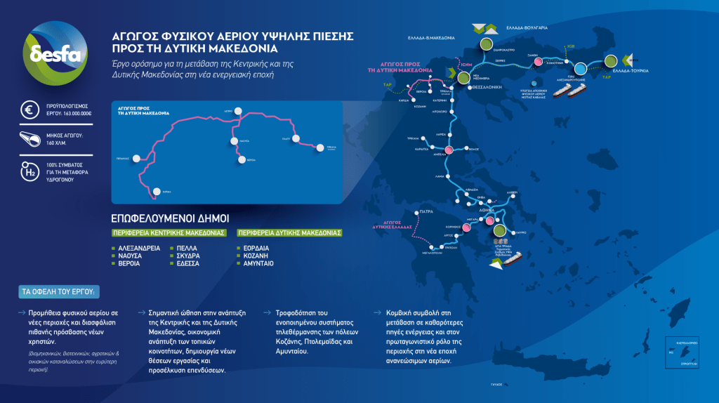 Με μήκος 160 περίπου χιλιομέτρων και προϋπολογισμό €163 εκατ., ο νέος αγωγός εξασφαλίζει την ομαλή μετάβαση των Περιφερειών Κεντρικής και Δυτικής Μακεδονίας στη μεταλιγνιτική εποχή, παρέχοντας πρόσβαση στο φυσικό αέριο σε πλήθος νέων περιοχών και χρηστών, ενώ ταυτόχρονα θέτει τις βάσεις για τον πρωταγωνιστικό τους ρόλο στη νέα εποχή καθαρής ενέργειας.