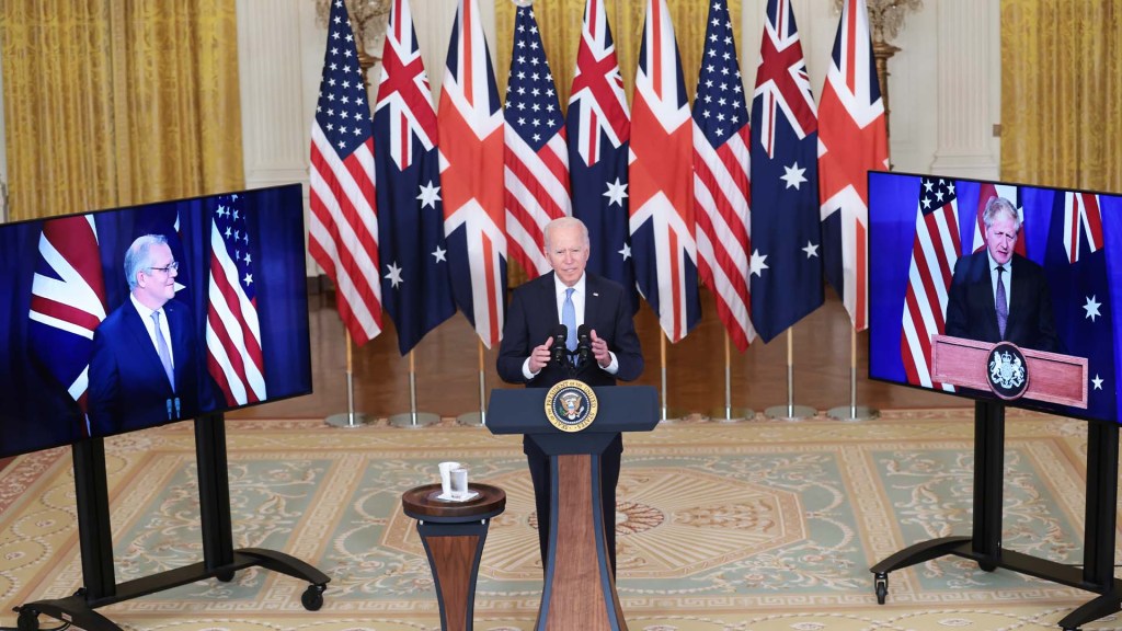 Η συνεργασία των τριών ισχυρότατων δυτικών κρατών ανακοινώθηκε τον Σεπτέμβριο του 2021 ως μέρος των στρατηγικών των ΗΠΑ και του Ηνωμένου Βασιλείου για βαθύτερη συνεργασία με τα κράτη του Ινδο-Ειρηνικού , κυρίως για την αντιμετώπιση της επιθετικής συμπεριφοράς του Πεκίνου στην περιοχή, συμπεριλαμβανομένου της θέσης που η Καμπέρα περιέγραψε ως «οικονομικό καταναγκασμό και επιθετισμό » του Πεκίνου.