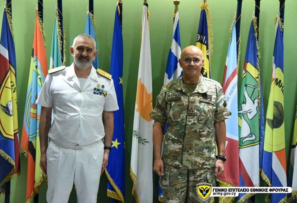 Με τον Αντιπλοίαρχο Stefano Turchetto, Επιχειρησιακό Διοικητή της επιχείρησης EUNAVFOR MED IRINI (European Union Naval Force Mediterranean Operation) συναντήθηκε χθες ο Αρχηγός της Εθνικής Φρουράς Αντιστράτηγος Δημόκριτος Ζερβάκης στο Στρατηγείο του Γενικού Επιτελείου Εθνικής Φρουράς, στο πλαίσιο των επαφών του με υψηλόβαθμους αξιωματικούς που παρευρέθηκαν στην Ημέρα Διακεκριμένων Επισκεπτών (DV-Day) της Άσκησης «ΑΡΓΟΝΑΥΤΗΣ-2023».