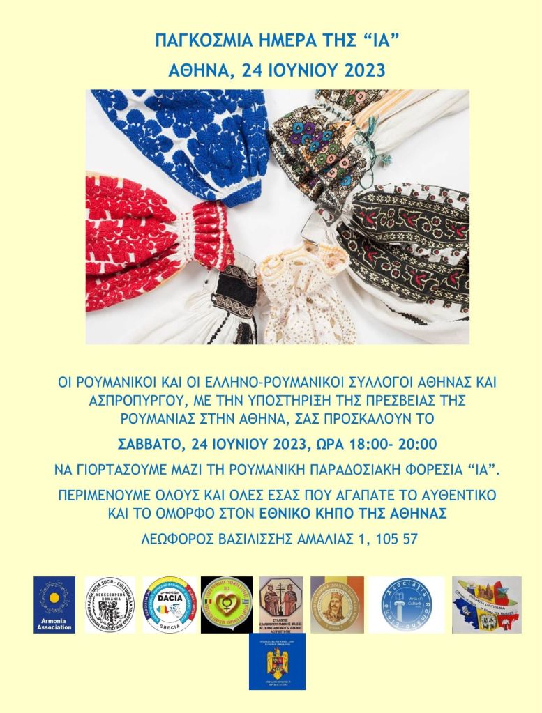 Εκδήλωση για την προβολή της ρουμανικής παραδοσιακής φορεσιάς “IA” διοργανώνεται στην Αθήνα με την υποστήριξη της Πρεσβείας της Ρουμανίας, ρουμανικών και ελληνο-ρουμανικών συλλόγων Αθηνών και Ασπροπύργου.