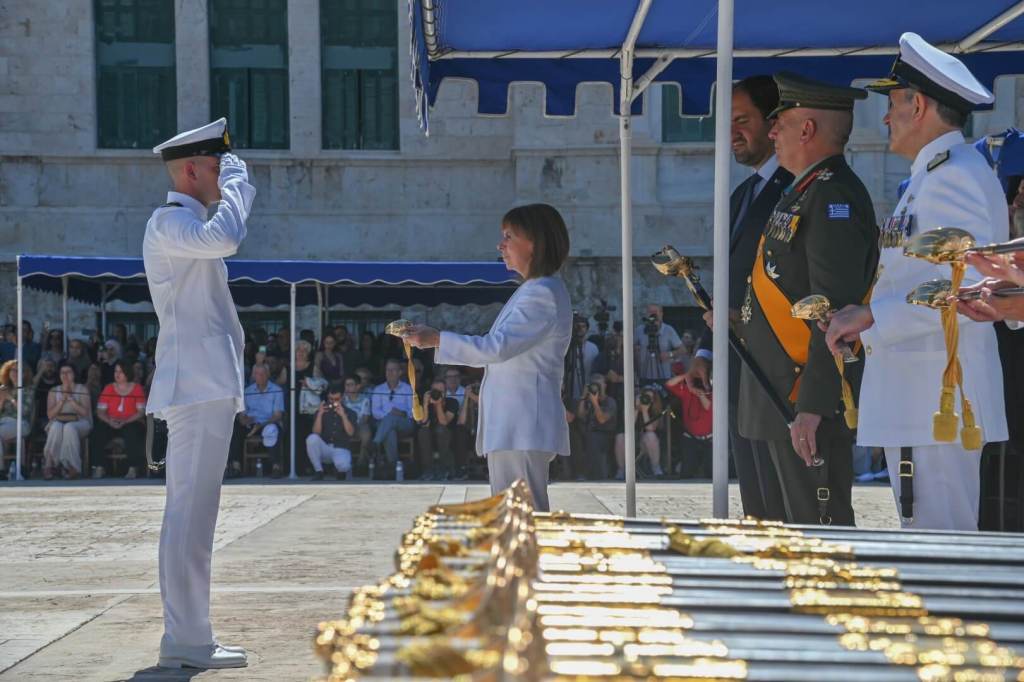 Η τελετή ορκωμοσίας των νέων Σημαιοφόρων του Πολεμικού Ναυτικού (ΠΝ) και του Λιμενικού Σώματος – Ελληνικής Ακτοφυλακής (Λ.Σ.-ΕΛ.ΑΚΤ.), τάξεως 2023, πραγματοποιήθηκε στη Σχολή Ναυτικών Δοκίμων (ΣΝΔ) χθες Τετάρτη 28 Ιουνίου 2023, παρουσία της Προέδρου της Δημοκρατίας Κατερίνας Σακελλαροπούλου, η οποία επέδωσε τα ξίφη στους ορκισθέντες. Συνολικά ορκίστηκαν 48 Αξιωματικοί ΠΝ (29 Μάχιμοι και 19 Μηχανικοί), εκ των οποίων 34 από την Ελλάδα, 10 από την Κυπριακή Δημοκρατία, 3 από την Ιορδανία και 1 από το Μαυροβούνιο, καθώς και 29 Σημαιοφόροι Λ.Σ-ΕΛ.ΑΚΤ.