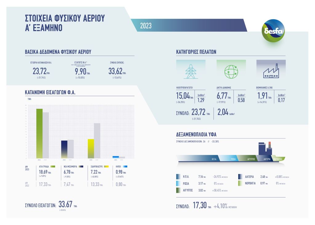 Σύμφωνα με τα στοιχεία του ΔΕΣΦΑ, κατά το πρώτο εξάμηνο του 2023, η εγχώρια κατανάλωση φυσικού αερίου μειώθηκε κατά 21,74%, αγγίζοντας τις 23,72 Τεραβατώρες (TWh), από 30,31 TWh στην αντίστοιχη περσινή περίοδο. Oι εξαγωγές ανήλθαν σε περίπου 9,9 ΤWh, καταγράφοντας αύξηση κατά 15,03% σε σχέση με πέρσι.