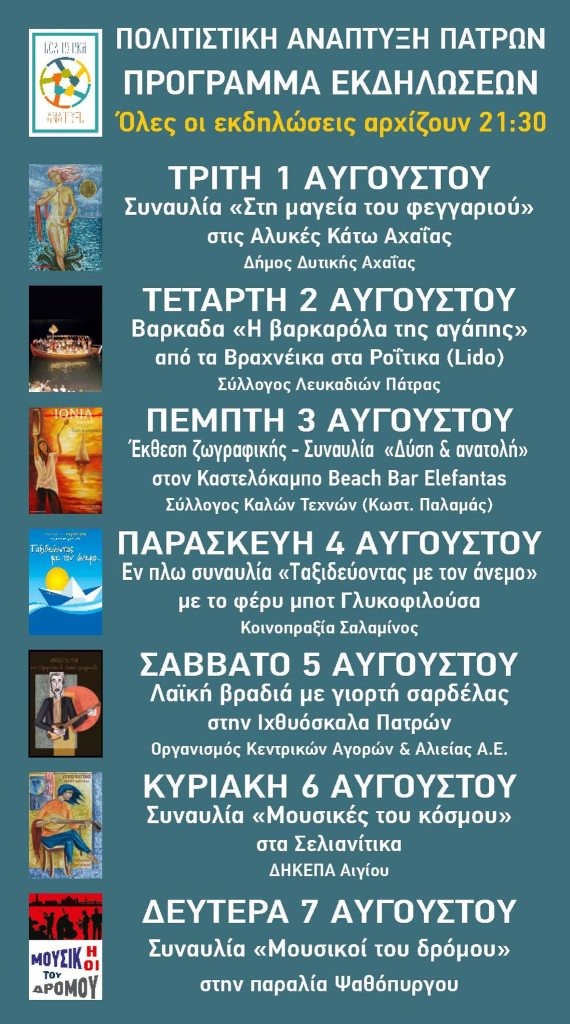 Μια σειρά ωραίων θαλασσινών θερινών εκδηλώσεων με την συμμετοχή της πάντα δραστήριας ΕΑΑΝ για τους τυχερούς που θα βρεθούν στις αχαϊκές παραλίες την πρώτη Αυγουστιάτικη εβδομα΄δα