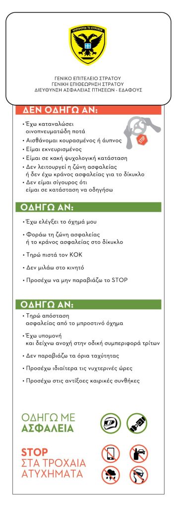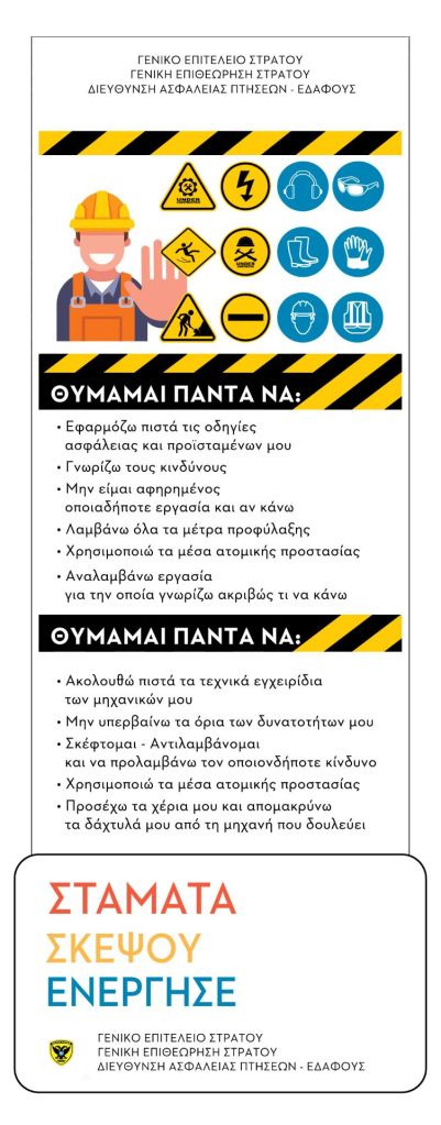 Το Γενικό Επιτελείο Στρατού, στο πλαίσιο της διαρκούς μέριμνας για την υγεία και ασφάλεια του προσωπικού, προέβη στη σύνταξη και διανομή 2 ενημερωτικών φυλλαδίων, «Υγεία και Ασφάλεια στην Εργασία» και «Οδική Ασφάλεια».