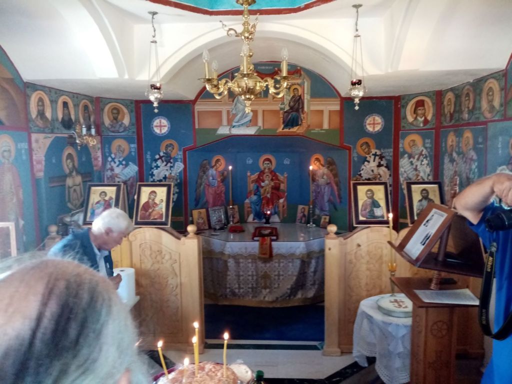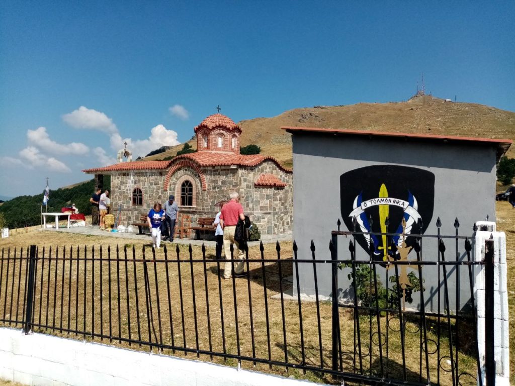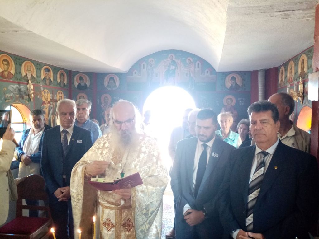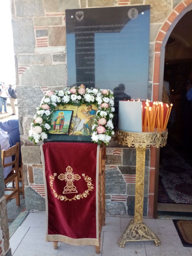 Πριν όμως προσεγγίσουμε το Μνημείο, εκ του σύνεγγυς, μπροστά μας ήταν το μικρό εκκλησάκι των Αγίου Ιωάννου Προδρόμου και Αγίου Γεωργίου Ελευθερωτή. Ημέρα Εορτής του Αγίου Φανουρίου η 27η Αυγούστου και μια κατανυκτική Θεία Λειτουργία ήταν ήδη σε εξέλιξη. Προσκυνήσαμε ευλαβικά και παρακολουθήσαμε την θρησκευτική τελετή. Ακολούθως, τελέστηκε αρτοκλασία και μνημόσυνο για την ανάπαυση των Πεσόντων Ηρώων με την επιμέλεια του Ιερέως και παλαιού καταδρομέα Πατρός Σταύρου.