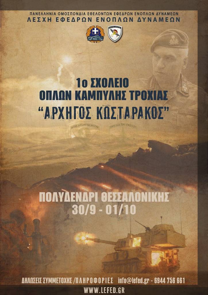 Το 1ο Σχολείο Όπλων Καμπύλης Τροχιάς “Αρχηγός Κωσταράκος” θα πραγματοποιηθεί από 30 Σεπτεμβρίου έως 1 Οκτωβρίου στο Πολυδένδρι Θεσσαλονίκης υπό την διοργάνωση της Λέσχης Εφέδρων Ενόπλων Δυνάμεων (ΛΕΦΕΔ) και της Πανελλήνιας Ομοσπονδίας Εθελοντών Εφέδρων Ενόπλων Δυνάμεων.
