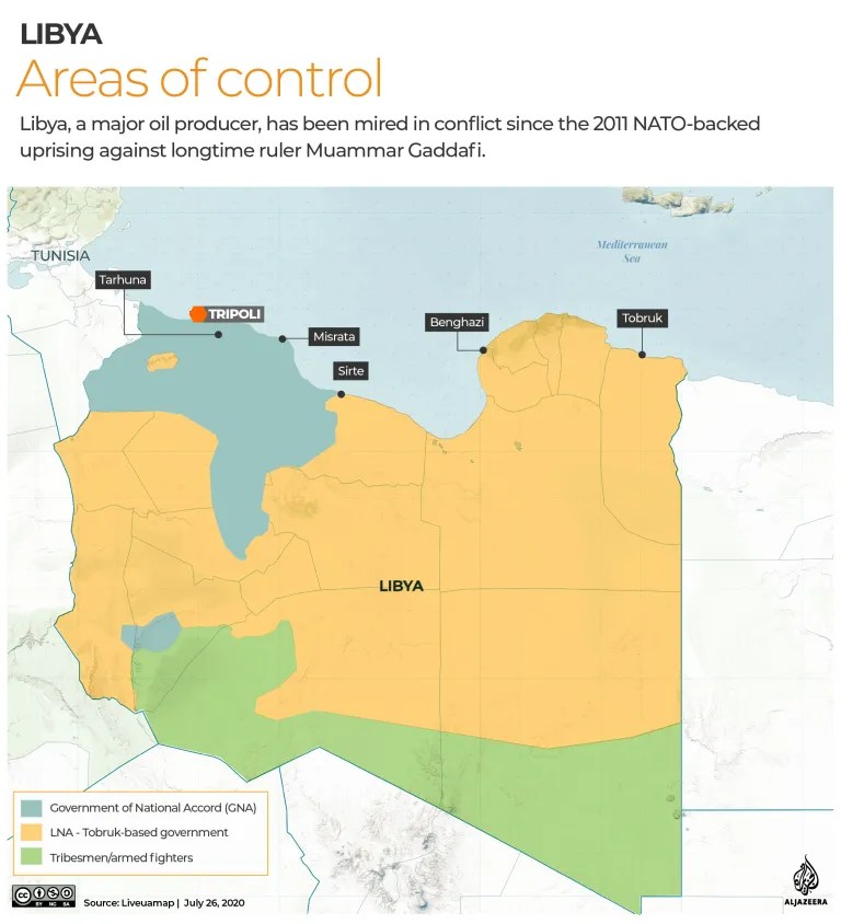 Η σύγκρουση στη Λιβύη έχει προκαλέσει μια γενικότερη αστάθεια στην Βόρεια Αφρική και έχει εξελιχθεί σε ένα μωσαϊκό γεωπολιτικών αντιπαραθέσεων. Στην Λιβύη η κατάσταση έχει ως εξής: στην Ανατολή και στο μεγαλύτερο μέρος της χώρας εξουσιάζει – με κάποιες περιοχές να είναι μόνο κατ’ όνομα ωστόσο – ο Χαλίφα Μπελκασίμ Χαφτάρ με τον Εθνικό Στρατό της Λιβύης (Libyan National Army – εφεξής LNA), η κυβέρνηση της Τρίπολης που υποστηρίζεται από τα Ηνωμένα Έθνη (Government of National Accord – εφεξής, GNA), ενώ υπάρχει και η στρατιωτική αποστολή του ΟΗΕ (United Nations Support Mission in Libya – εφεξής UNSMIL).