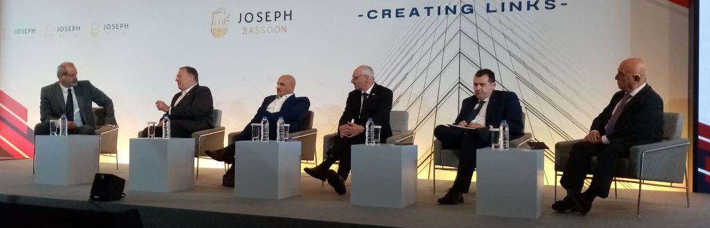 φωτ. από δεξιά τω βλέποντι ο Πρέσβης ε.τ. κ. Ιωάννης – Αλέξιος Ζέπος, δεξιά του ο Πρέσβης της Κύπρου κ. Κυριάκος Κενεβέζος, δίπλα του ο Πρέσβης του Ισραήλ κ. Noam Katz, αμέσως μετά ο κ. David Sassoon, έχοντας στα δεξιά του τον κ. Μάικ Πομπέο και στα αριστερά τω βλέποντι ο δημοσιογράφος κ. Αθανάσιος Έλλις συντονιστής της συζήτησης
