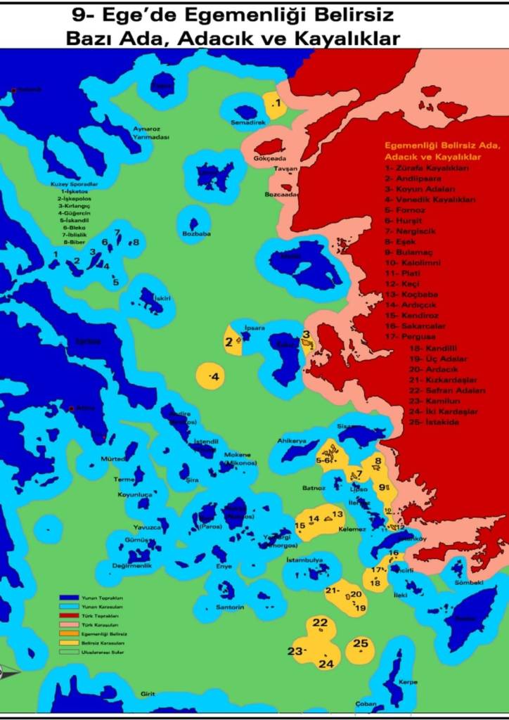 Στο Αιγαίο, σε αντίθεση με ότι αφήνεται να εννοηθεί, οι διεκδικήσεις της εκτείνονται σε πολύ συγκεκριμένα νησάκια, τα οποία τεμαχίζουν την κυριαρχία της Ελλάδας, όμως το μεγάλο στοίχημα είναι στον οριζόντιο Άξονα Κύπρου – Κρήτης.