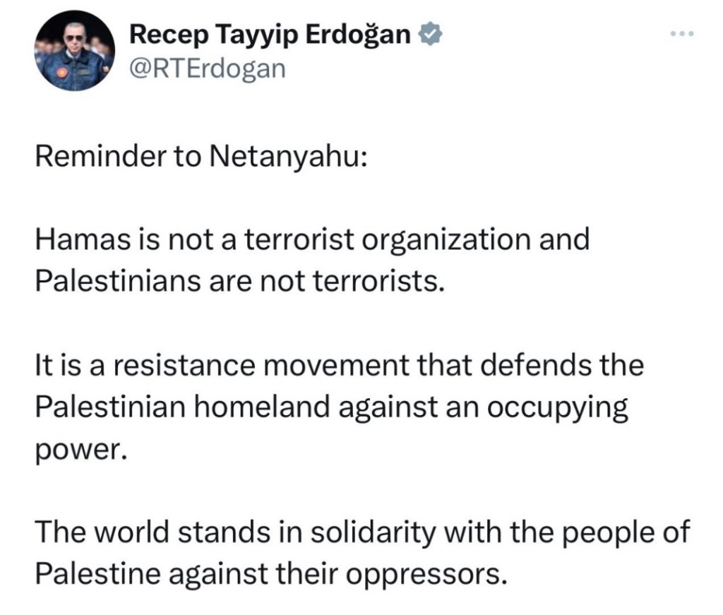Περίεργη η στάση της Τουρκίας εάν κρίνουμε από το μήνυμα του Ερντογάν προς τον Νετανυάχου, όπου υποστηρίζει τον αγώνα της Χαμάς.