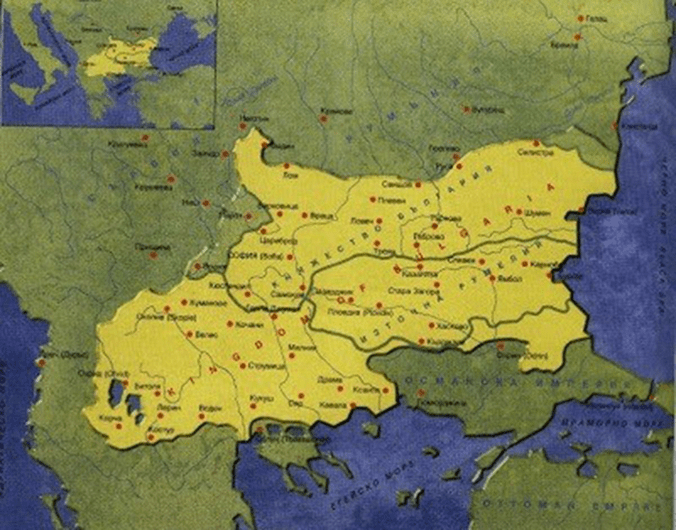 Το 1877 κηρύχθηκε ο ρωσοτουρκικός πόλεμος, ο οποίος το 1878 καταλήγει στη «Συνθήκη του Αγίου Στεφάνου», η οποία προέβλεπε τη δημιουργία της Μεγάλης Βουλγαρίας, δηλαδή την σημερινή Βουλγαρία, την ευρύτερη περιοχή των Σκοπίων και όλη η κεντρική Μακεδονία μέχρι την Καβάλα, όπως φαίνεται στον χάρτη. Οι Μεγάλες Δυνάμεις, πλην Ρωσίας, αντιδρούν και η συνθήκη δεν εφαρμόζεται ποτέ.