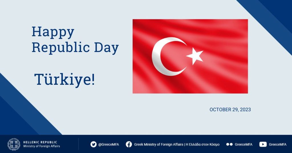Ανακοίνωση εξέδωσε η Ελληνική Λύση αναφορικά με το ευχετήριο μήνυμα του Υπουργείου Εξωτερικών στο Χ (πρώην twitter) προς την Τουρκία όπου συγχαίρει τον λαό και την κυβέρνηση της Τουρκίας για την Ημέρα Δημοκρατίας.