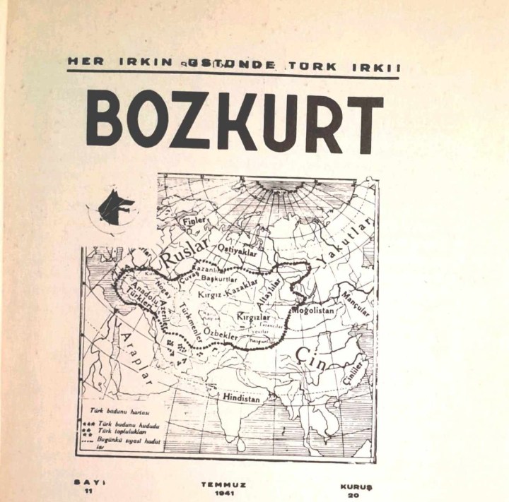 Εξώφυλλο του παντουρκικού περιοδικού Μποζκούρτ που κυκλοφόρησε μεταξύ 1939 – 1942 και δείχνει την διεκδικούμενη έκταση της “τουρκικής πατρίδας”. Πάνω από την τίτλο διαβάζουμε: “Η τουρκική φυλή υπεράνω όλων”, ενώ ο Μποζκούρτ, ο λύκος της Στέπας υπάρχει δίπλα στον τίτλο.