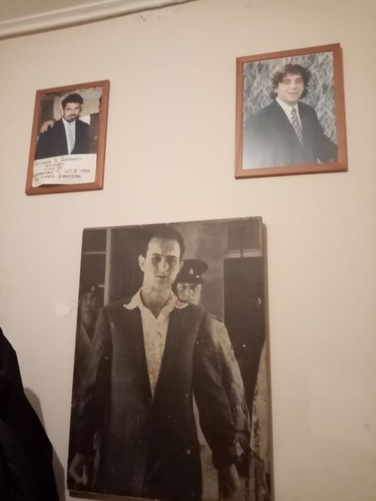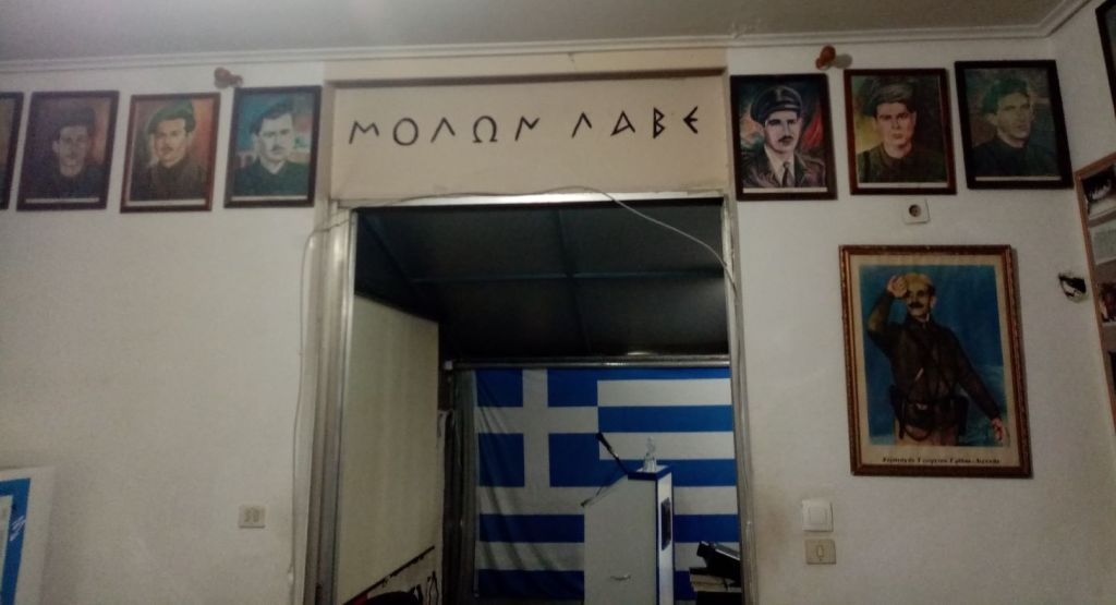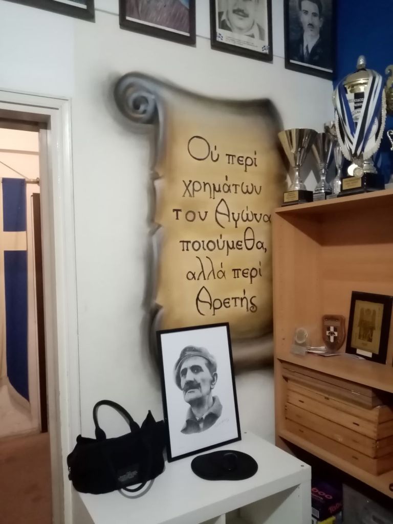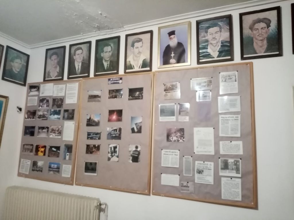 Παντού αναρτημένες φωτογραφίες Κυπρίων Ηρώων Αγωνιστών. Λίγο πιο πέρα η Ελληνική σημαία και η επιγραφή πάνω από αυτήν «ΜΟΛΩΝ ΛΑΒΕ».