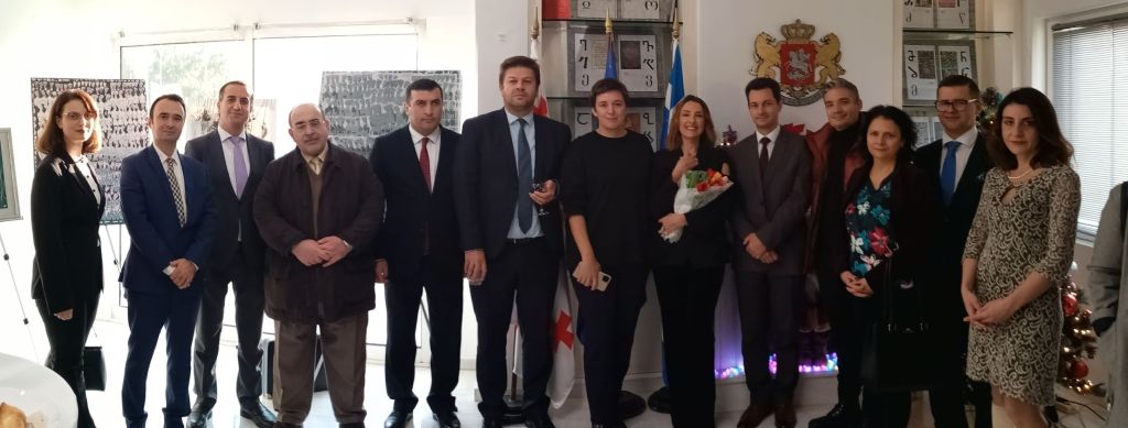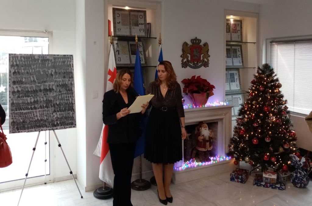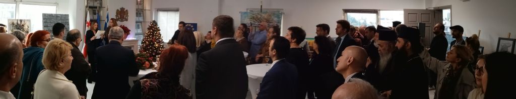 Τα εγκαίνια της Χριστουγεννιάτικης έκθεσης με έργα Γεωργιανών καλλιτεχνών που είχε επιμεληθεί η Πρεσβεία έγιναν σε μια εξόχως εορταστική ατμόσφαιρα όπου επικράτησε το αδιαχώρητο και είναι η δεύτερη χρονιά που η έκθεση πραγματοποιείται στον ίδιο χώρο. Ο στολισμός, εν όψει των Χριστουγέννων, της αίθουσας εκδηλώσεων της Πρεσβείας, «έδεσε» όμορφα με τα εκτεθειμένα εικαστικά έργα, την ανταλλαγή ευχών για τις εορταστικές ημέρες αλλά και με τις γευστικές δημιουργίες που είχαν ετοιμάσει οι διοργανωτές να μας κεράσουν στην αποχαιρετιστήρια δεξίωση που θα ακολουθούσε λόγω της ολοκλήρωσης της θητείας στην Ελλάδα της δυναμικής Επιτετραμμένης της Γεωργιανής Πρεσβείας κυρίας Darejan Mumladge και της επιστροφής στην Πατρίδα της.
