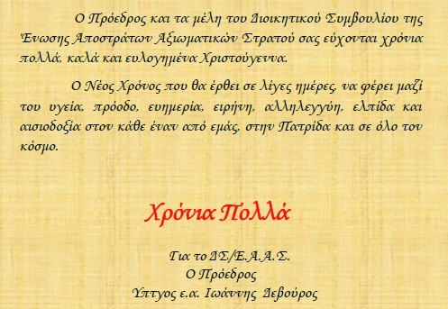 Ευχές για τις γιορτινές ημέρες στέλνει σε όλους το Διοικητικό Συμβούλιο της Ενώσεως Αποστράτων Αξιωματικών Στρατού (ΕΑΑΣ) δια του Προέδρου της Υποστρατήγου ε.α. Ιωάννη Δεβούρου.